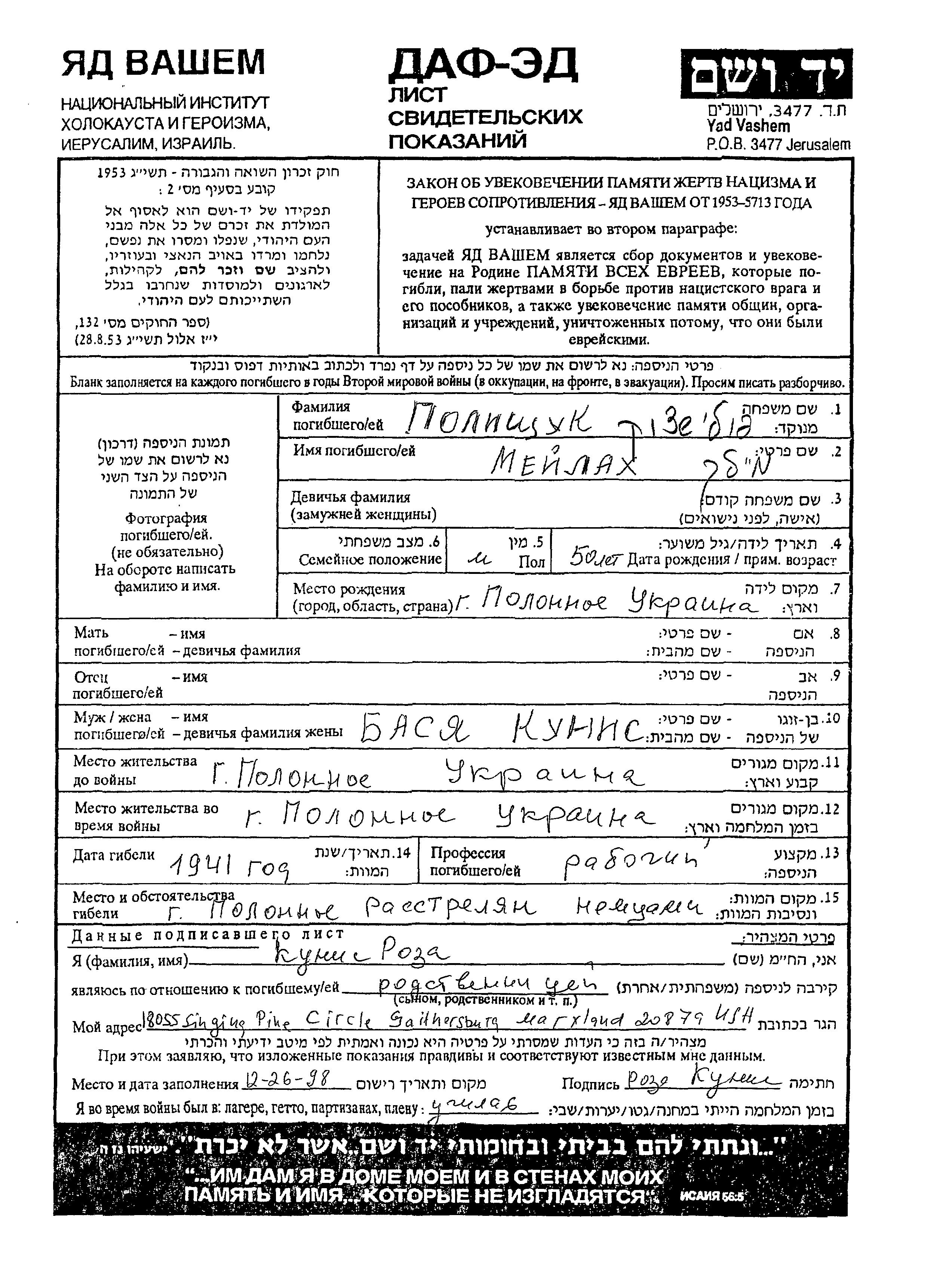 Meilakh פולישצוק נולד בPolonnoye שבאוקראינה (ברה"מ). הוא היה פועל ונשוי לBasya לבית קוניס. לפני מלחמת העולם השניה התגורר בPolonnoye שבאוקראינה (ברה"מ). בזמן המלחמה הוא היה בPolonnoye שבאוקראינה (ברה"מ). הוא נרצח בשואה. מקום המוות: Polonnoye שבאוקראינה (ברה"מ) בשנת 1941.
