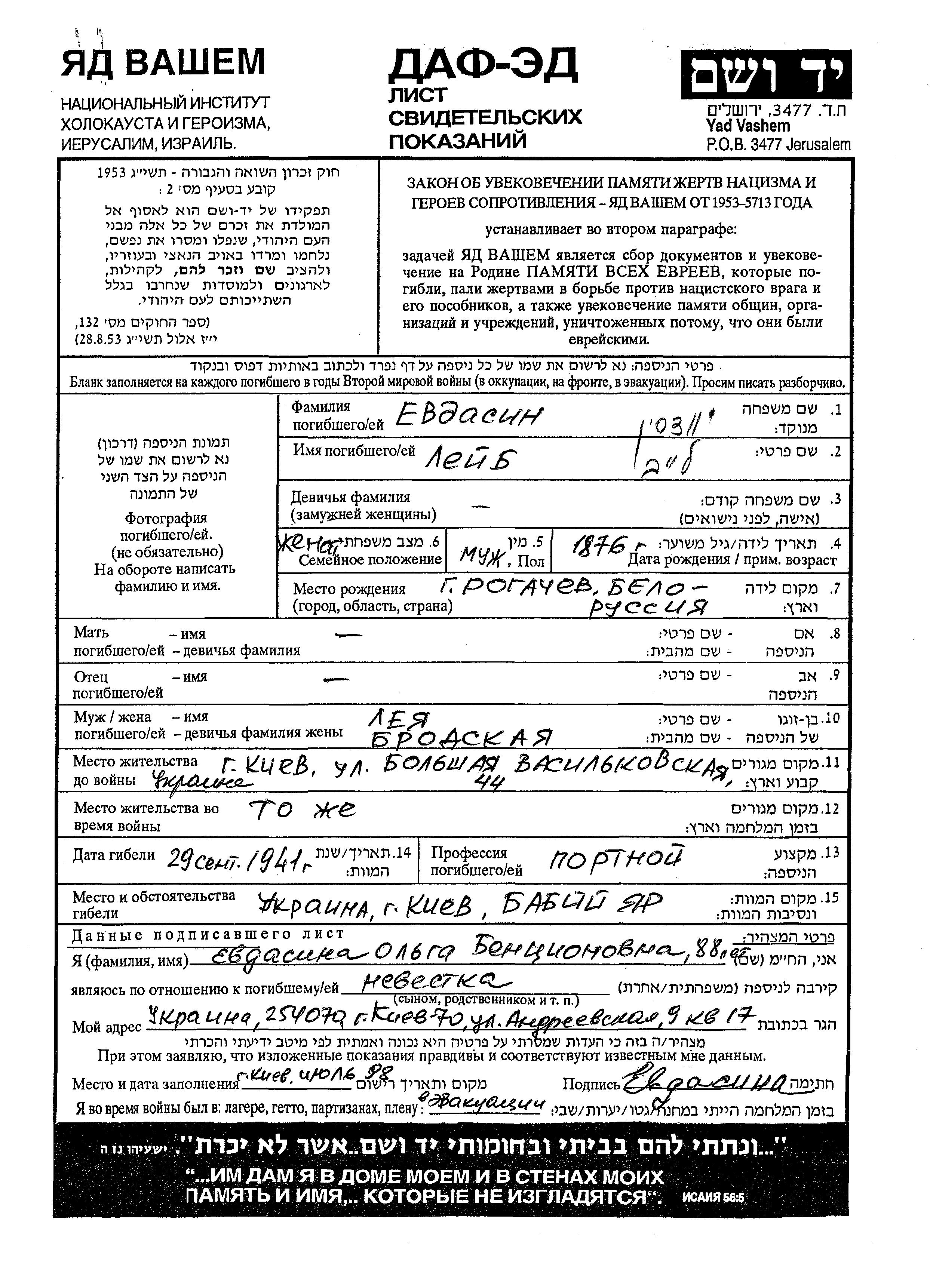לייב נרצח בשואה. מקום המוות: Babi Yar שבאוקראינה (ברה"מ) בשנת 29/09/1941.