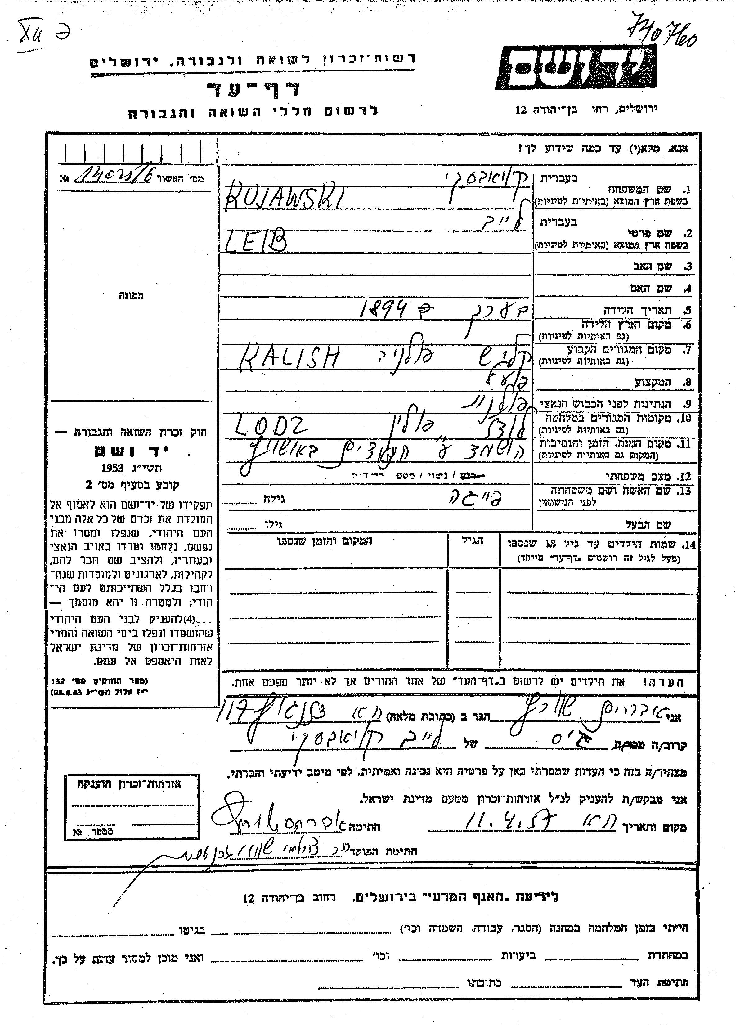 לייב Kujawski נולד בשנת 1894. הוא היה פועל ונשוי לפייגה. לפני מלחמת העולם השניה התגורר בKalisz שבפולין. בזמן המלחמה הוא היה בLodz שבפולין.