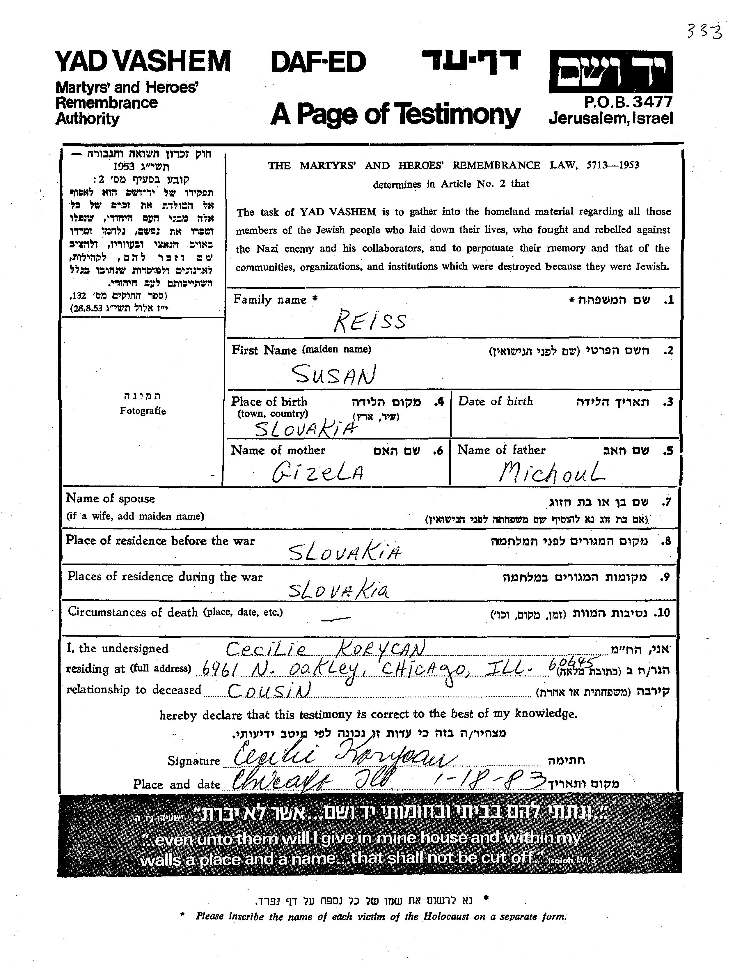 Susan Reiss נולדה בSlovakia שבצ'כוסלובקיה לMichoul וגיזלה. לפני מלחמת העולם השניה התגוררה בSlovakia שבצ'כוסלובקיה. בזמן המלחמה היא היתה בSlovakia שבצ'כוסלובקיה.