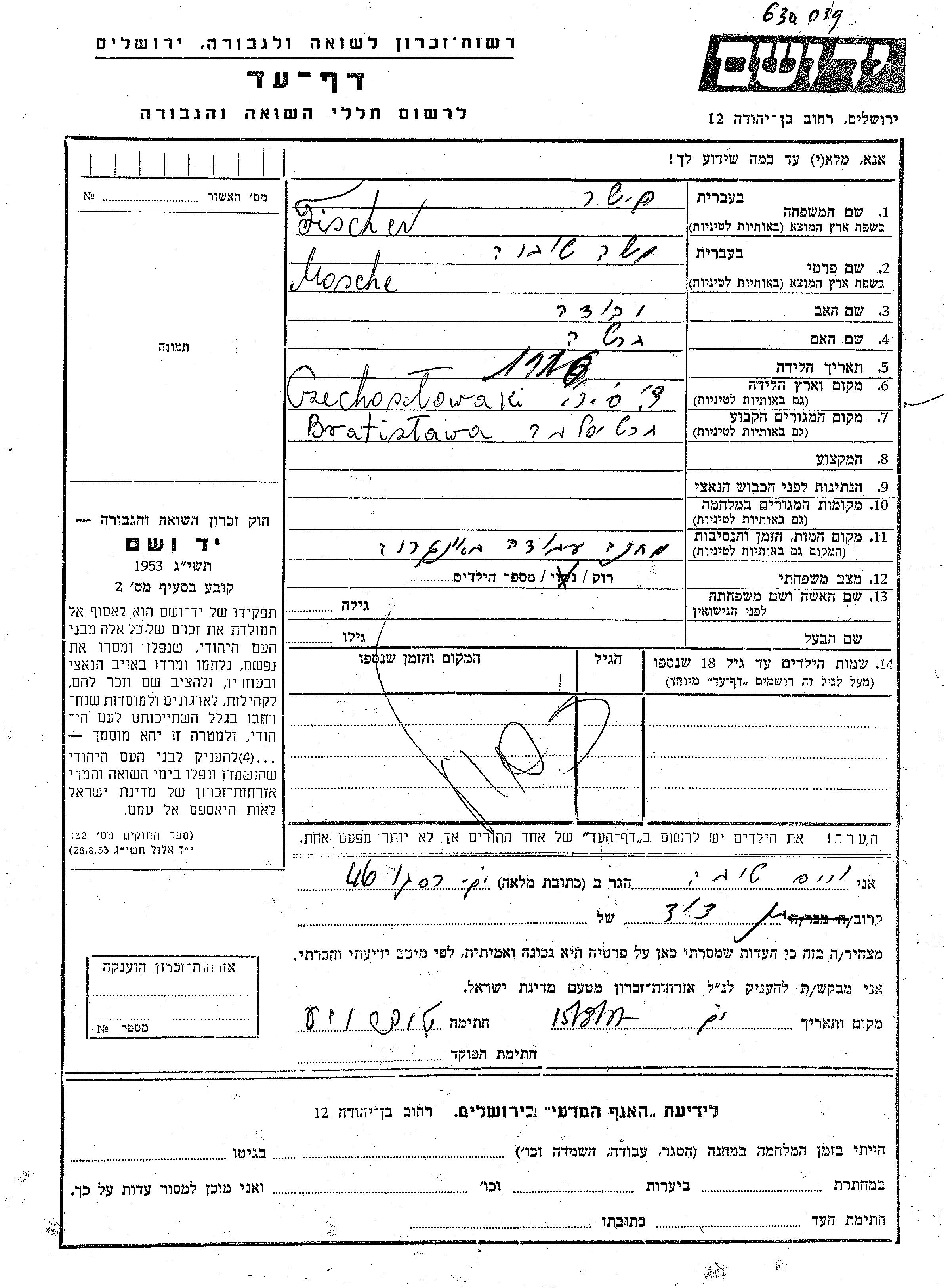 Mosche טוביה Fischer נולד בצ'כוסלובקיה בשנת 1916 ליהודה וברטה. הוא היה רווק. לפני מלחמת העולם השניה התגורר בBratislava שבצ'כוסלובקיה. הוא נרצח בשואה. מקום המוות: הונגריה.