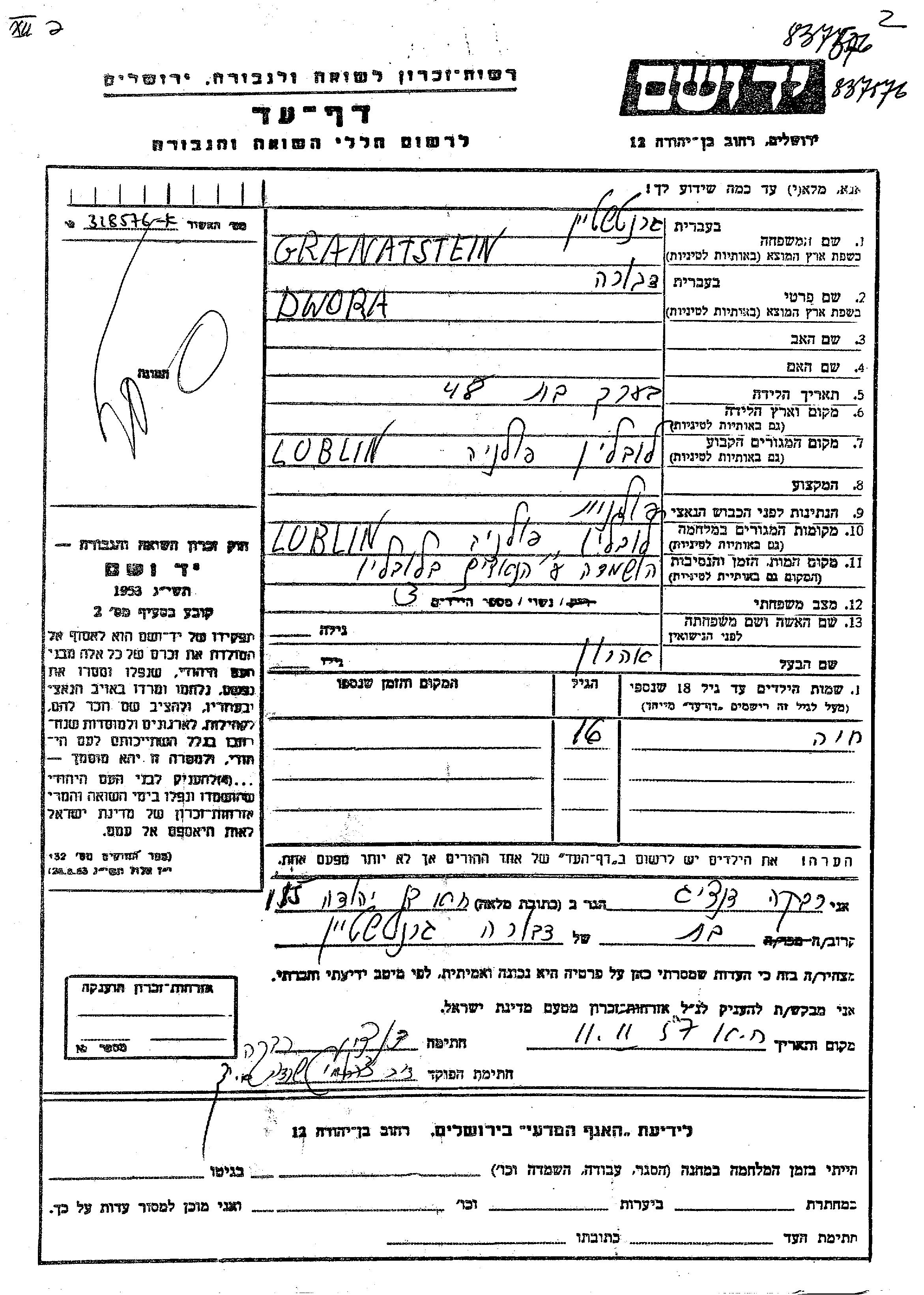 Dwora Granatstein. היא היתה נשואה לאהרן. לפני מלחמת העולם השניה התגוררה בLublin שבפולין. בזמן המלחמה היא היתה בLublin שבפולין.