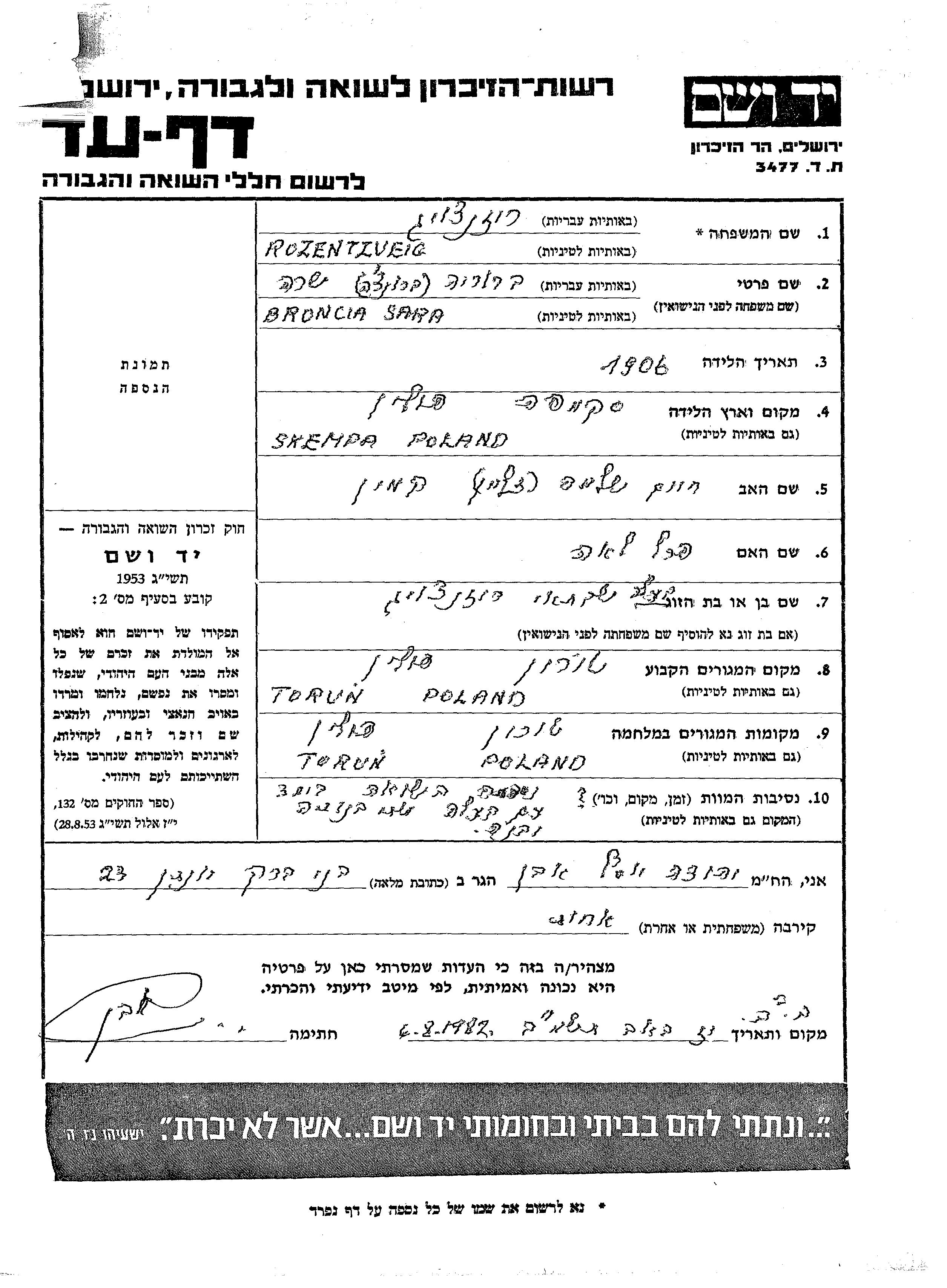 Broncia ברוריה שרה רוזנצויג לבית קמין נולדה בSkempa שבפולין בשנת 1906 לחיים שלמה ופרל לאה. היא היתה נשואה לשבתאי. לפני מלחמת העולם השניה התגוררה בTorun שבפולין. בזמן המלחמה היא היתה בTorun שבפולין. היא נרצחה בשואה.