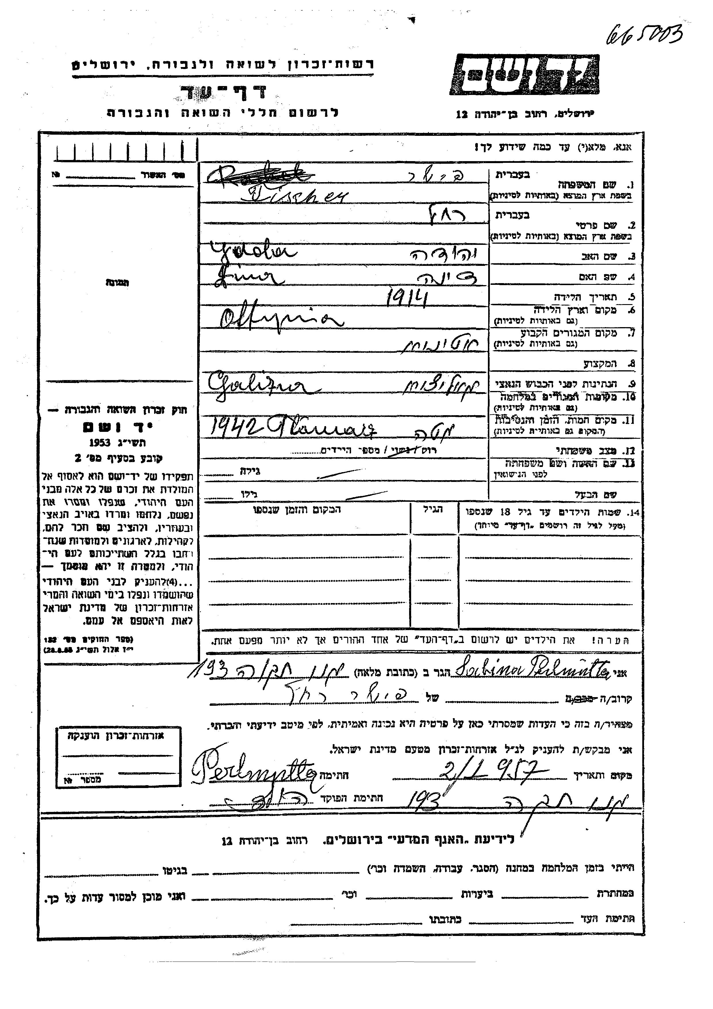 רחל Fischer נולדה בOttynia שבפולין בשנת 1912 לJuda וברכה. בזמן המלחמה היא היתה בOttynia שבפולין. רחל נרצחה בשואה. מקום המוות: Tlumach שבפולין בשנת 1942.