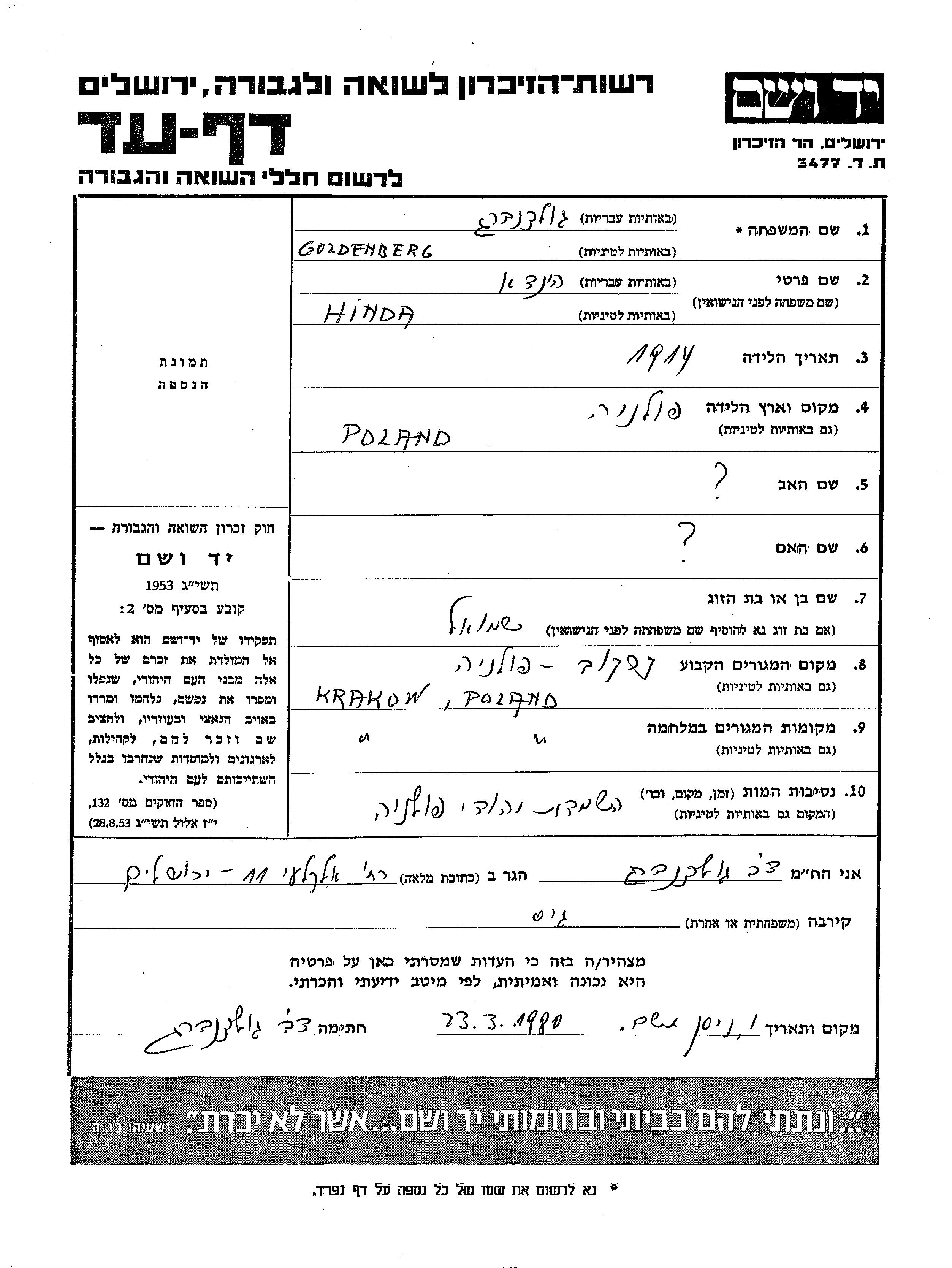 הינדא גולדנברג נולדה בפולין שבפולין בשנת 1914. היא היתה נשואה לשמואל. לפני מלחמת העולם השניה התגוררה בKrakow שבפולין. בזמן המלחמה היא היתה בKrakow שבפולין. הינדא נרצחה בשואה. מקום המוות: פולין שבפולין.