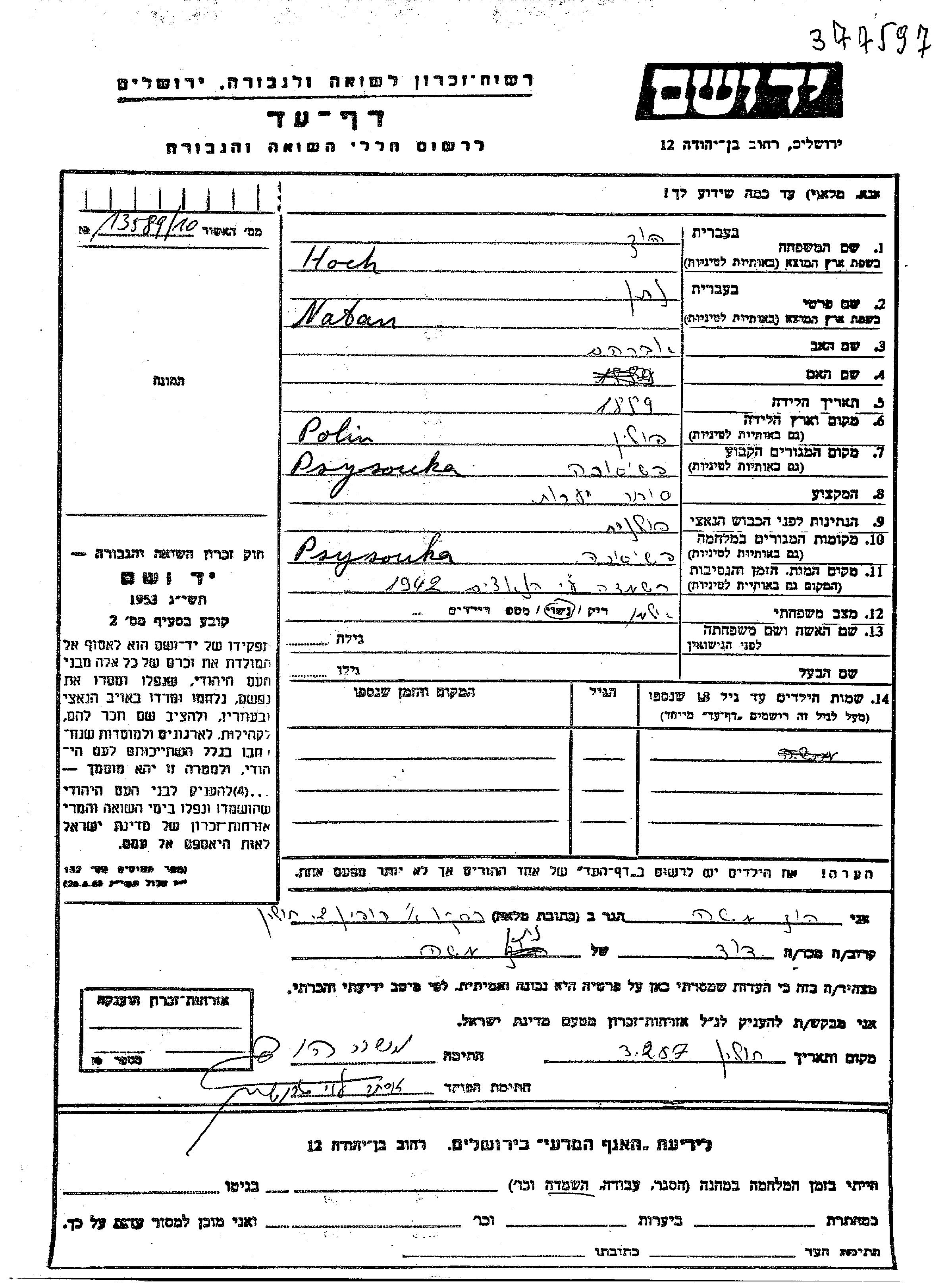 Hoch נתן 1889 Przysucha, פולין דף-עד