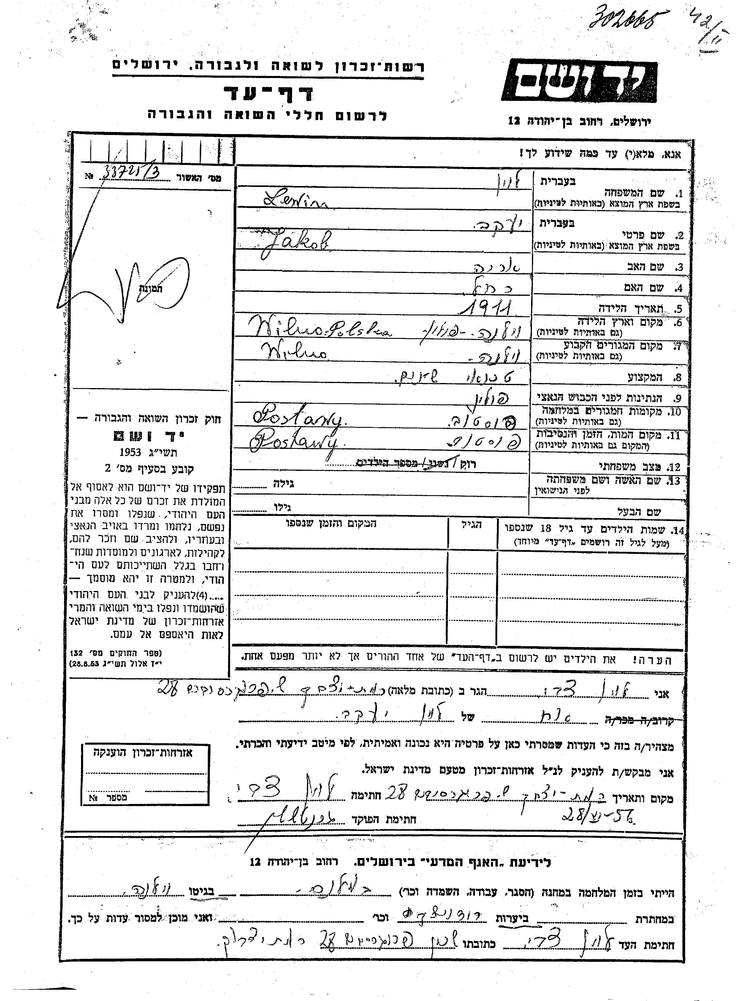 Jakob Lewin נולד בWilno שבפולין בשנת 1911 לאריה ורחל. הוא היה טכנאי שיניים ורווק. לפני מלחמת העולם השניה התגורר בWilno שבפולין. בזמן המלחמה הוא היה בPostawy שבפולין. הוא נרצח בשואה. מקום המוות: Postawy שבפולין.