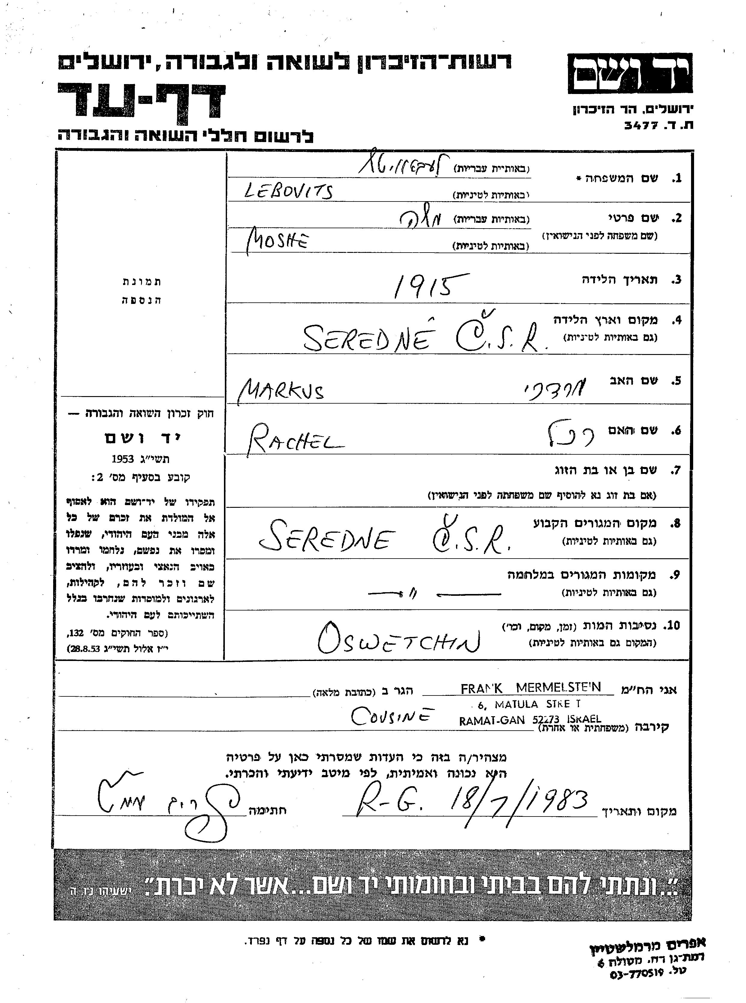 משה Lebovits נולד בSeredne שבצ'כוסלובקיה בשנת 1915 למרדכי מרקוס ורחל. לפני מלחמת העולם השניה התגורר בSeredne שבצ'כוסלובקיה. בזמן המלחמה הוא היה בSeredne שבצ'כוסלובקיה. משה נרצח בשואה. מקום המוות: Auschwitz שבפולין.