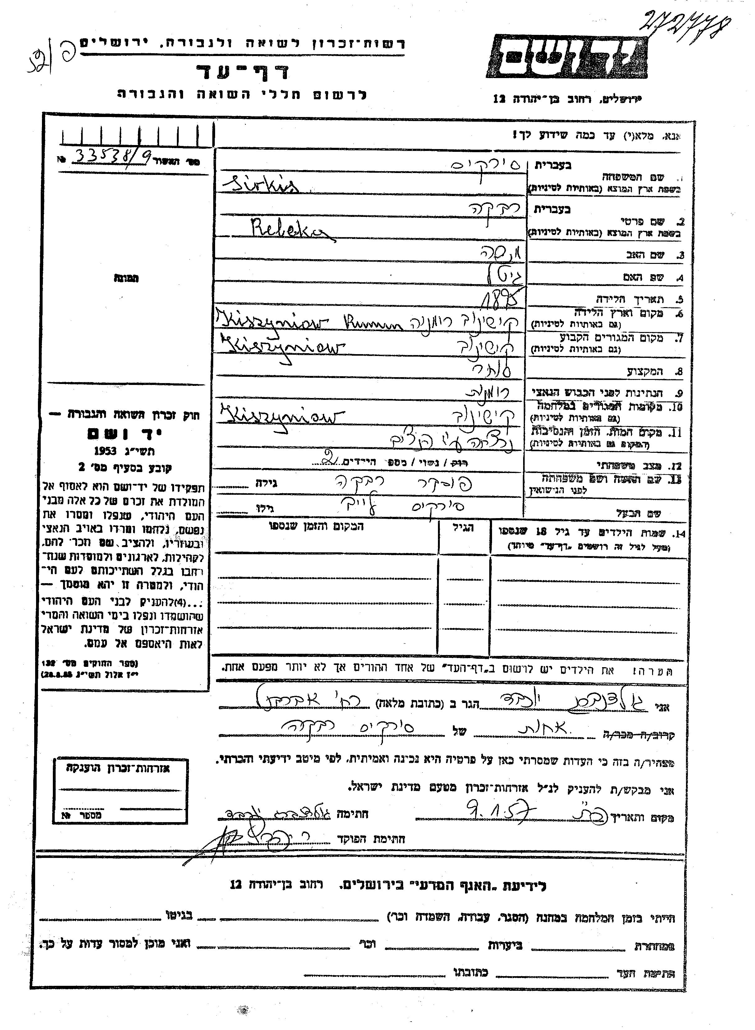 Rebeka סירקיס לבית פוסקר נולדה בKiszyniow שברומניה בשנת 1895 למשה וגיטל. היא היתה סוחרת ונשואה ללייב. לפני מלחמת העולם השניה התגוררה בKiszinow שברומניה. בזמן המלחמה היא היתה בKiszyniow שברומניה.