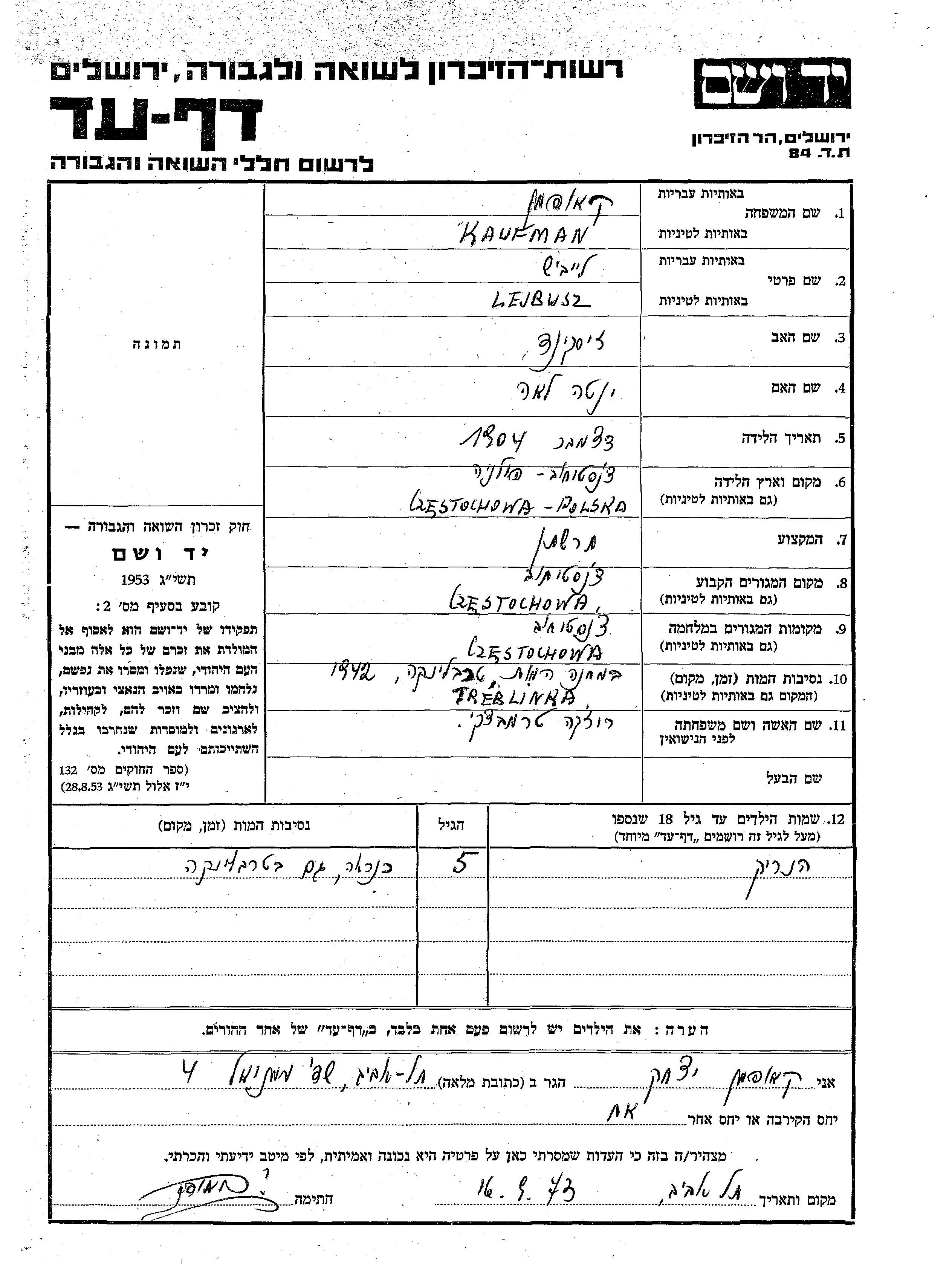 קאופמן Lejbusz 1904 Czestochowa, פולין דף-עד