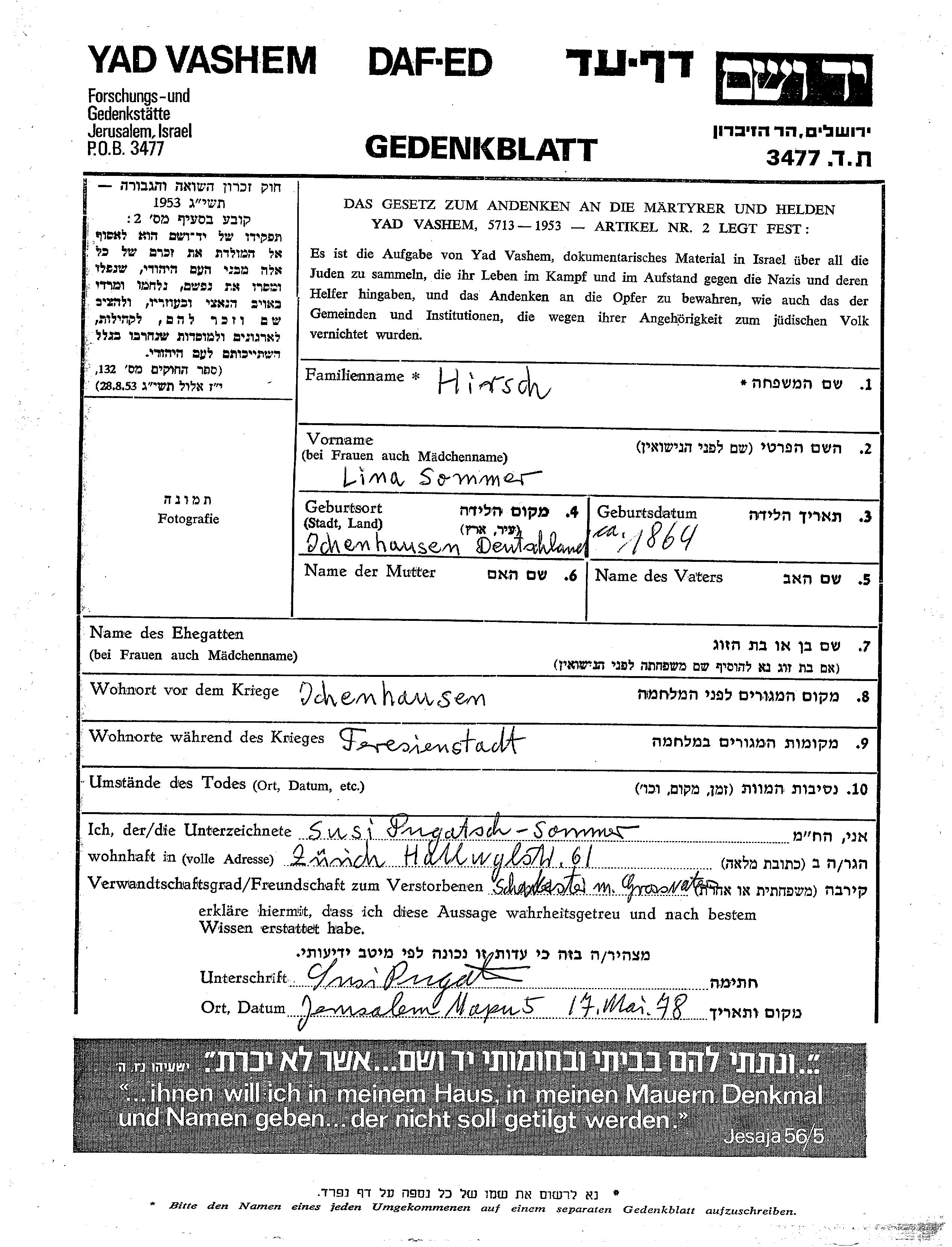 לינה Hirsch לבית Sommer נולדה בIchenhausen שבגרמניה בשנת 1864. היא היתה נשואה. לפני מלחמת העולם השניה התגוררה בIchenhausen שבגרמניה. בזמן המלחמה היא היתה בTheresienstadt שבצ'כוסלובקיה. לינה נרצחה בשואה.