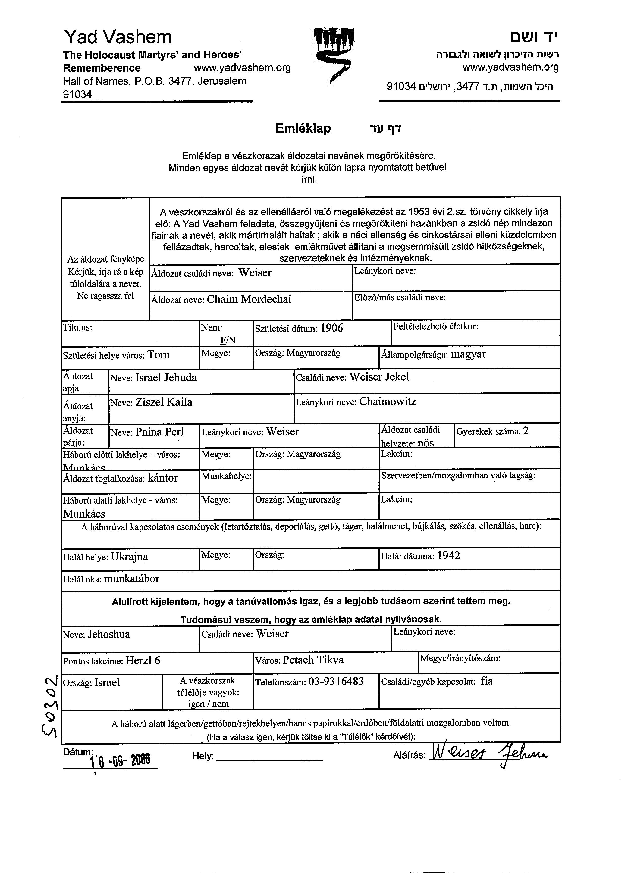 מורדכי חיים Weiser נולד בTorn שבצ'כוסלובקיה בשנת 1906 לJehuda Israel וKaila Ziszel לבית Chaimowitz. הוא היה חזן ונשוי לPerl פנינה. לפני מלחמת העולם השניה התגורר בMunkacs שבצ'כוסלובקיה. בזמן המלחמה הוא היה בMunkacs שבצ'כוסלובקיה. מורדכי חיים נרצח בשואה. מקום המוות: אוקראינה (ברה"מ) בשנת 1942.