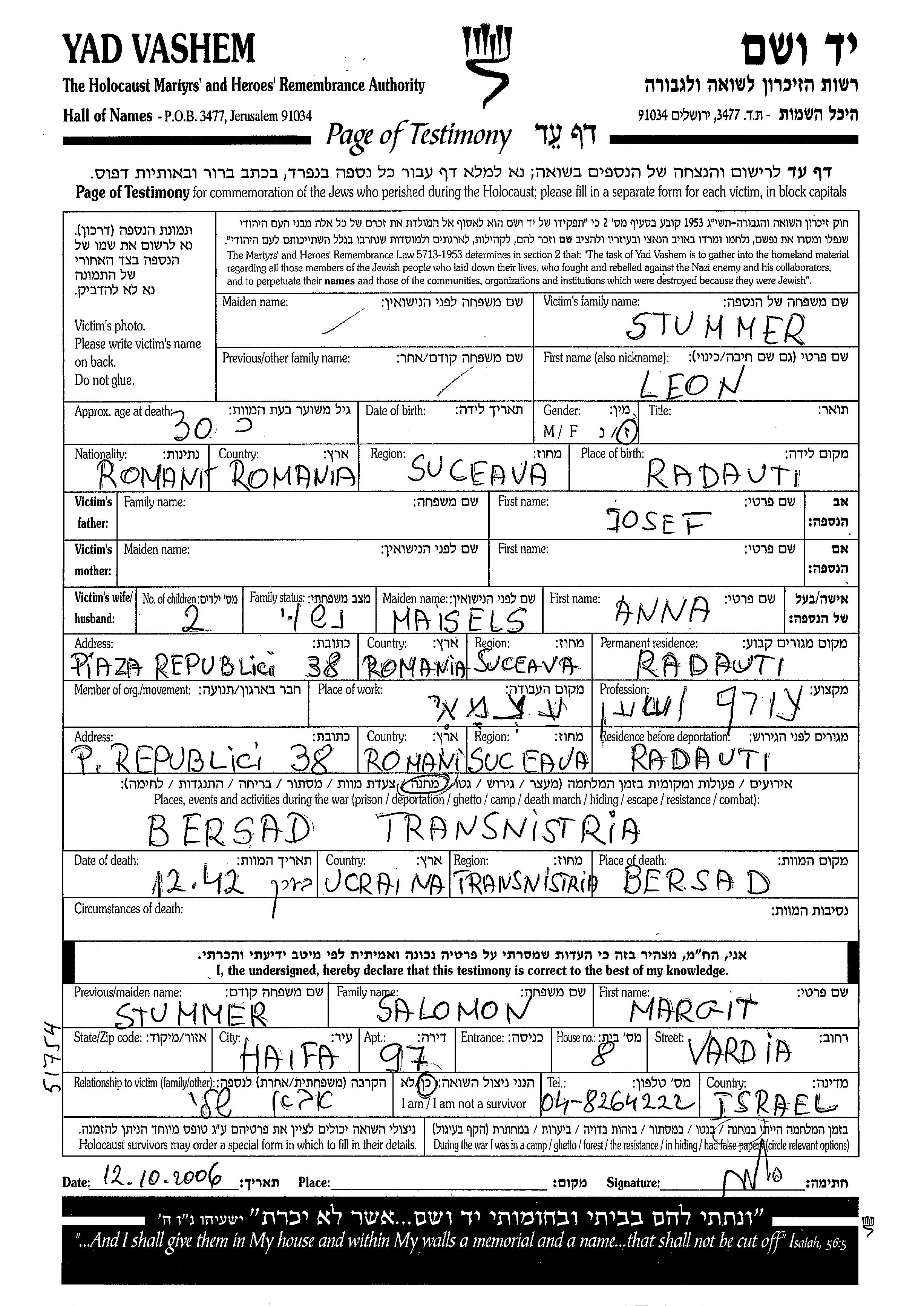 לאון Stummer נולד בRadauti שברומניה לJosef. הוא היה שען ונשוי לאנה לבית Maisels. לפני מלחמת העולם השניה התגורר בRadauti שברומניה. בזמן המלחמה הוא היה בRadauti שברומניה. לאון נרצח בשואה. מקום המוות: Bershad שבאוקראינה (ברה"מ) בשנת 12/1942.