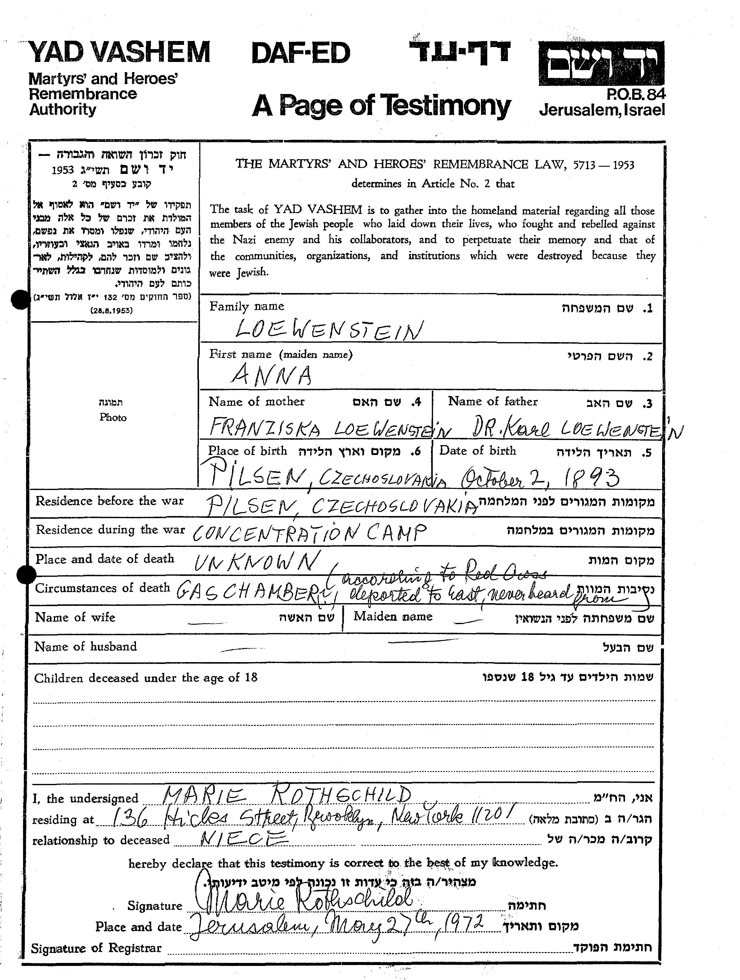 Loewenstein אנה 1893 Pilsen, צ'כוסלובקיה דף-עד