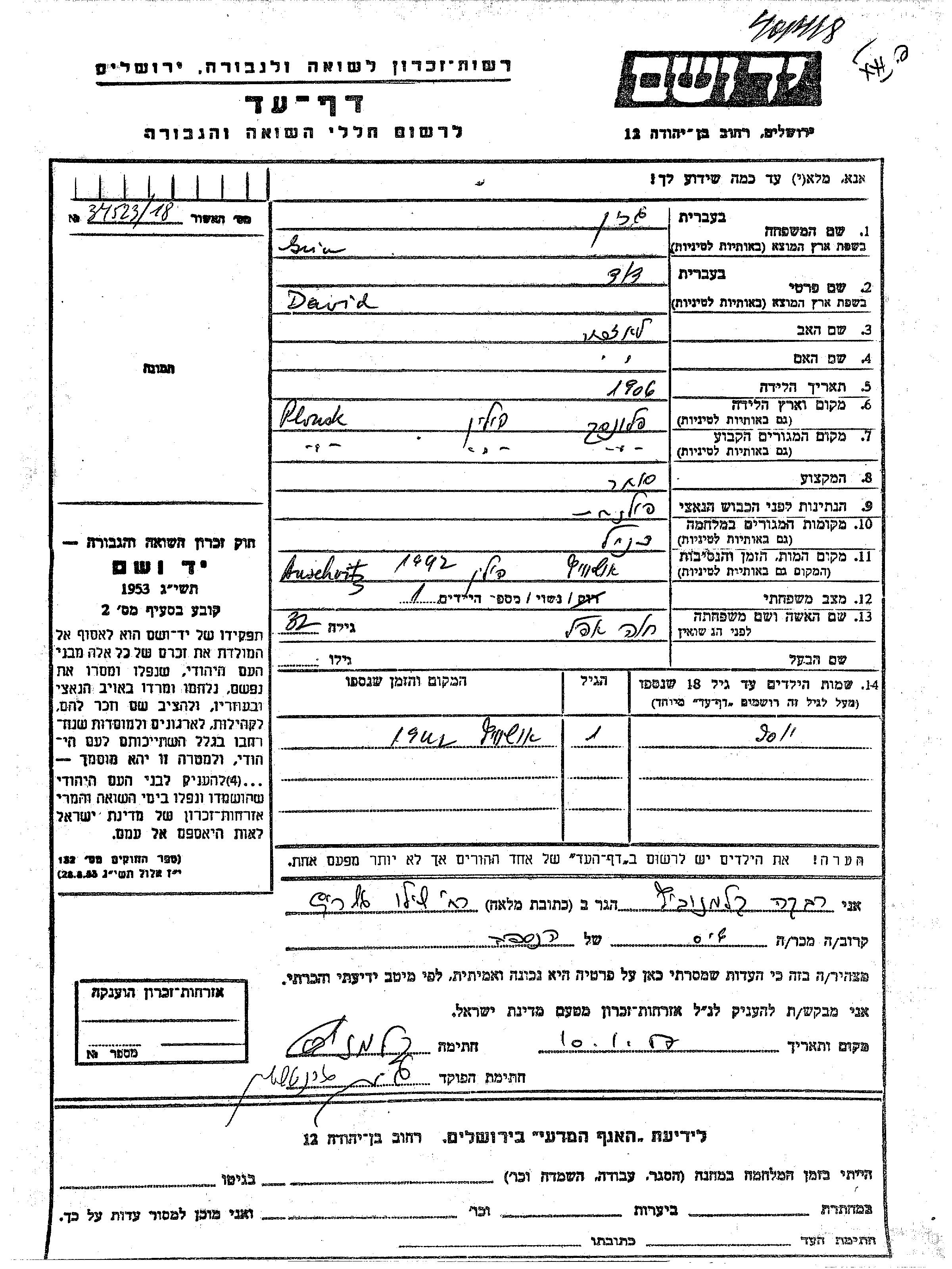 דוד נרצח בשואה. מקום המוות: Auschwitz שבפולין בשנת 1942.