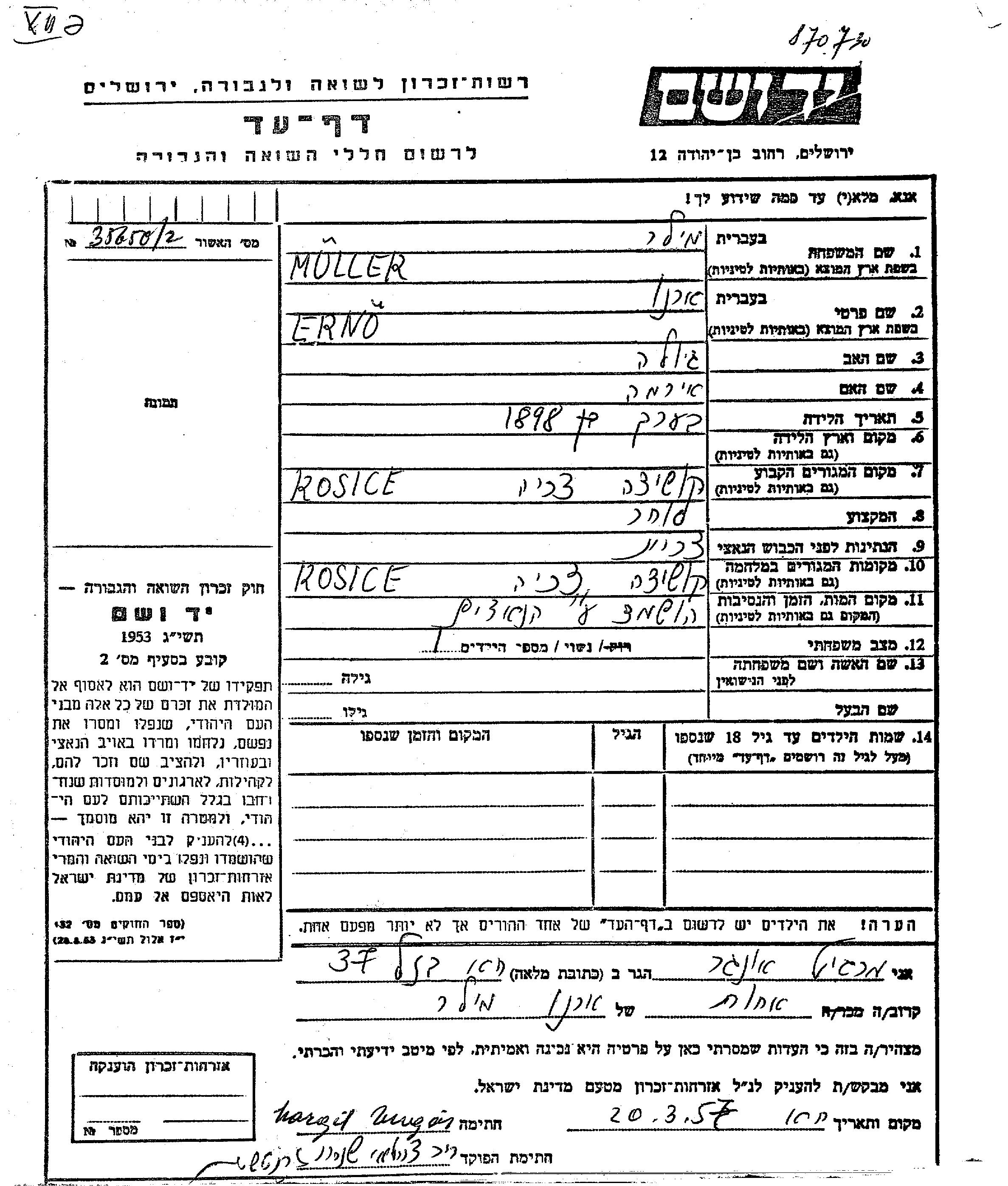 ארנו Muller נולד בשנת 1898 לגיולה ואירמה. הוא היה סוחר ונשוי. לפני מלחמת העולם השניה התגורר בKosice שבצ'כוסלובקיה. בזמן המלחמה הוא היה בKosice שבצ'כוסלובקיה. ארנו נרצח בשואה.