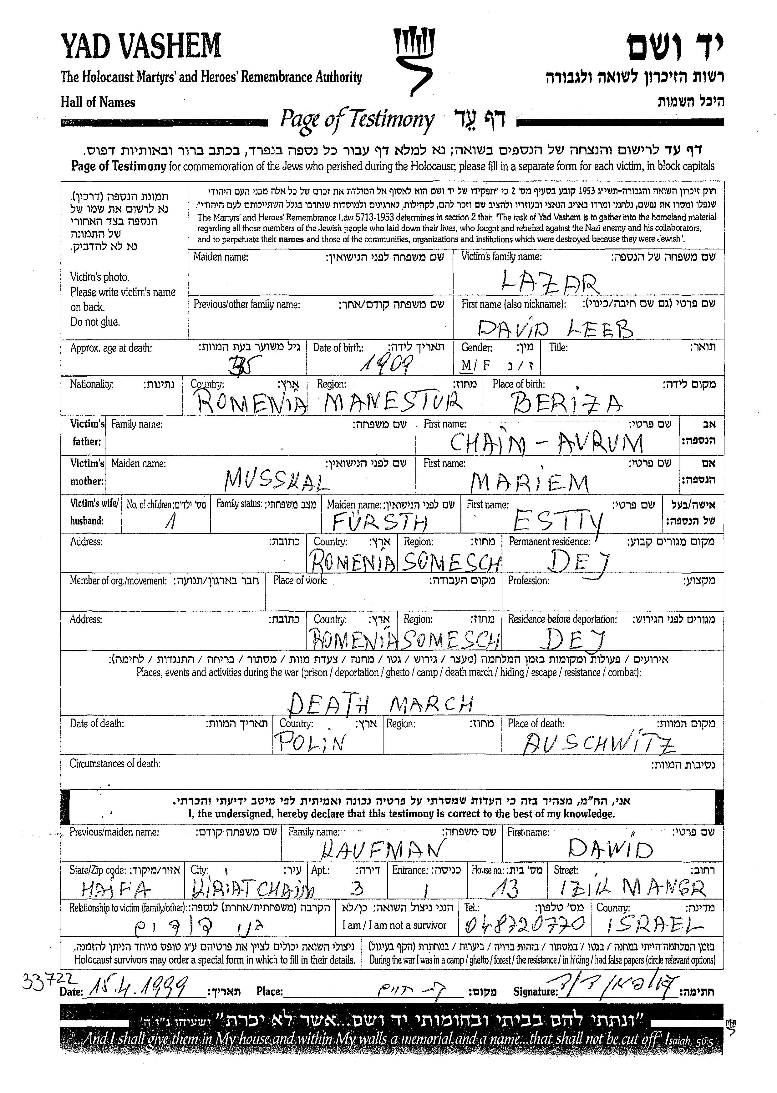 Leeb דוד לזר נולד בBreaza שברומניה בשנת 1909 לAvrum חיים וMariem לבית Musskal. הוא היה נשוי לEstty לבית Fursth. לפני מלחמת העולם השניה התגורר בDej שברומניה. בזמן המלחמה הוא היה בDej שברומניה.