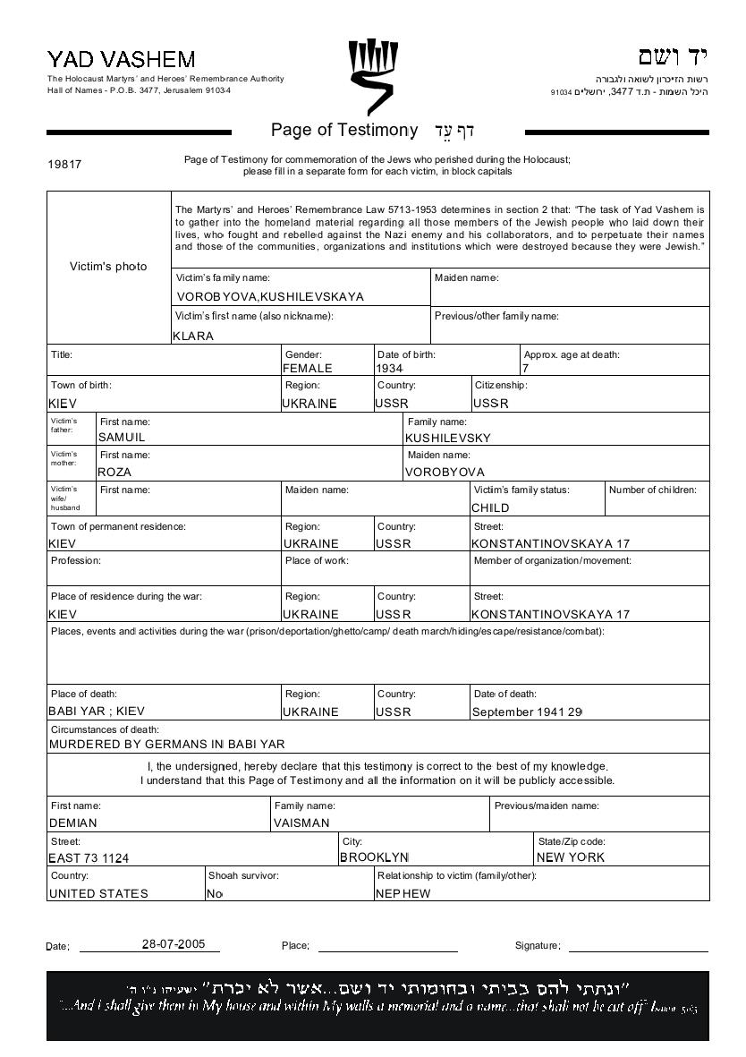 קלרה נרצחה בשואה. מקום המוות: Babi Yar שבאוקראינה (ברה"מ) בשנת 29/09/1941.