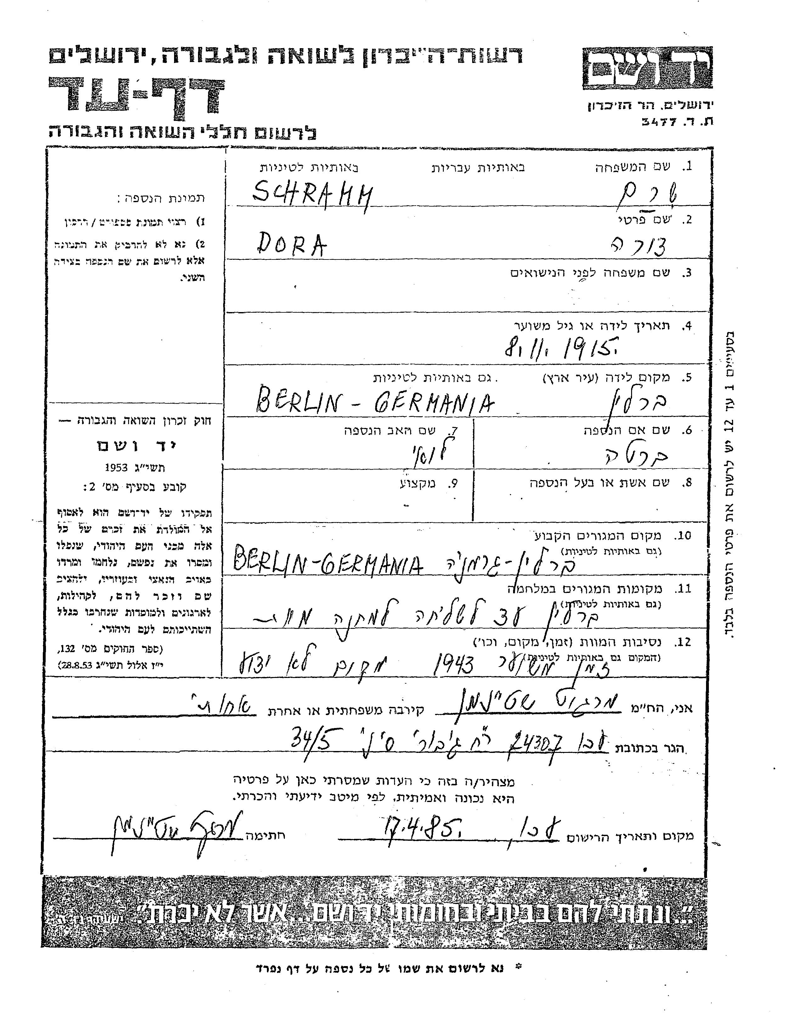 דורה נרצחה בשואה. מקום המוות: לא ידוע בשנת 1943.