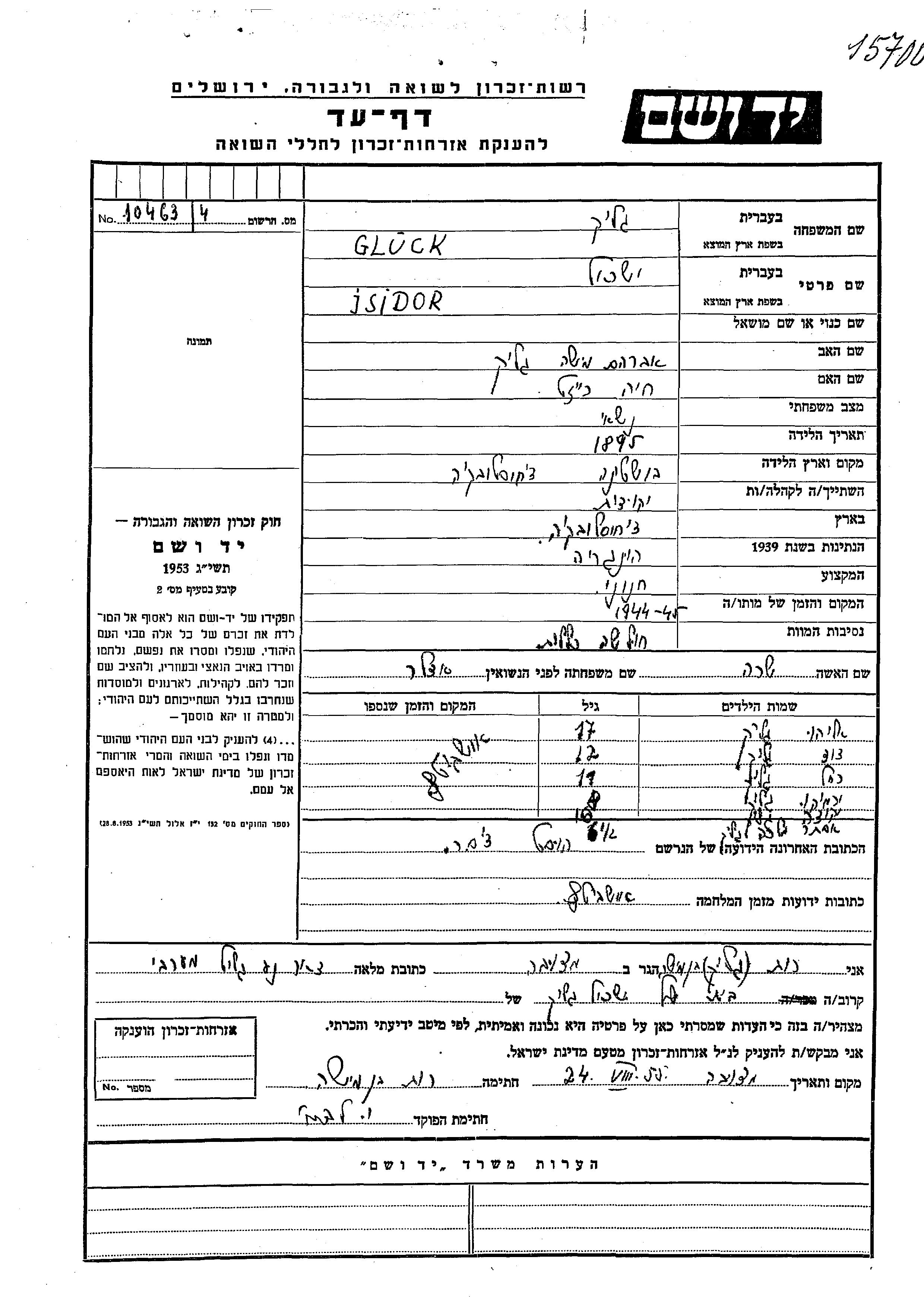 Isidor ישראל Gluck נולד בBushtina שבצ'כוסלובקיה בשנת 1895 לאברהם משה וחיה רייזל. הוא היה חנווני ונשוי לשרה לבית אדלר. לפני מלחמת העולם השניה התגורר בצ'כוסלובקיה. בזמן המלחמה הוא היה בOświęcim שבפולין. הוא נרצח בשואה. מקום המוות: לא ידוע בשנת 1944.