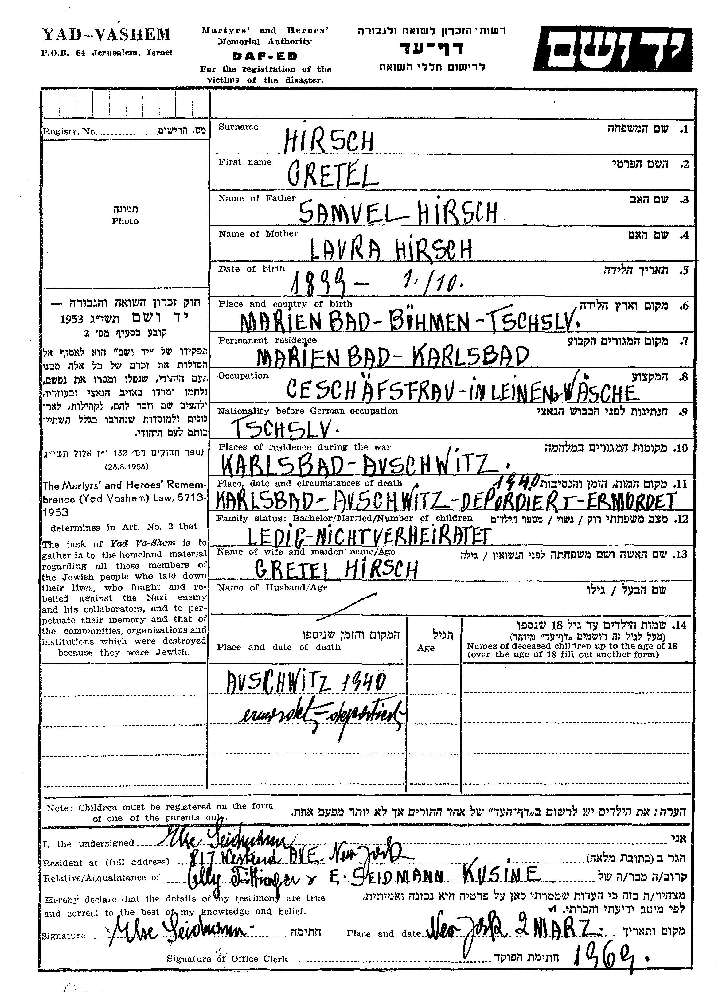 Gretel Hirsch נולדה בMarienbad שבצ'כוסלובקיה בשנת 1899 לסמואל ולאורה. היא היתה Geschaeftsfrau in leinen waesche ורווקה. לפני מלחמת העולם השניה התגוררה בKarlsbad שבצ'כוסלובקיה. בזמן המלחמה היא היתה בAuschwitz שבפולין. היא נרצחה בשואה. מקום המוות: Auschwitz שבפולין בשנת 1940.