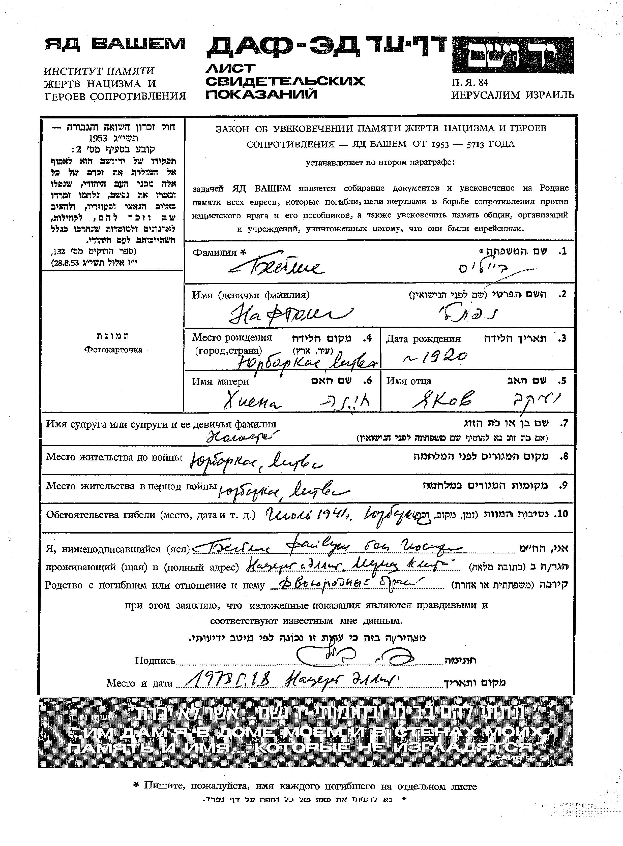 הוא נרצח בשואה. מקום המוות: Yurbarkas שבליטא בשנת 07/1941.