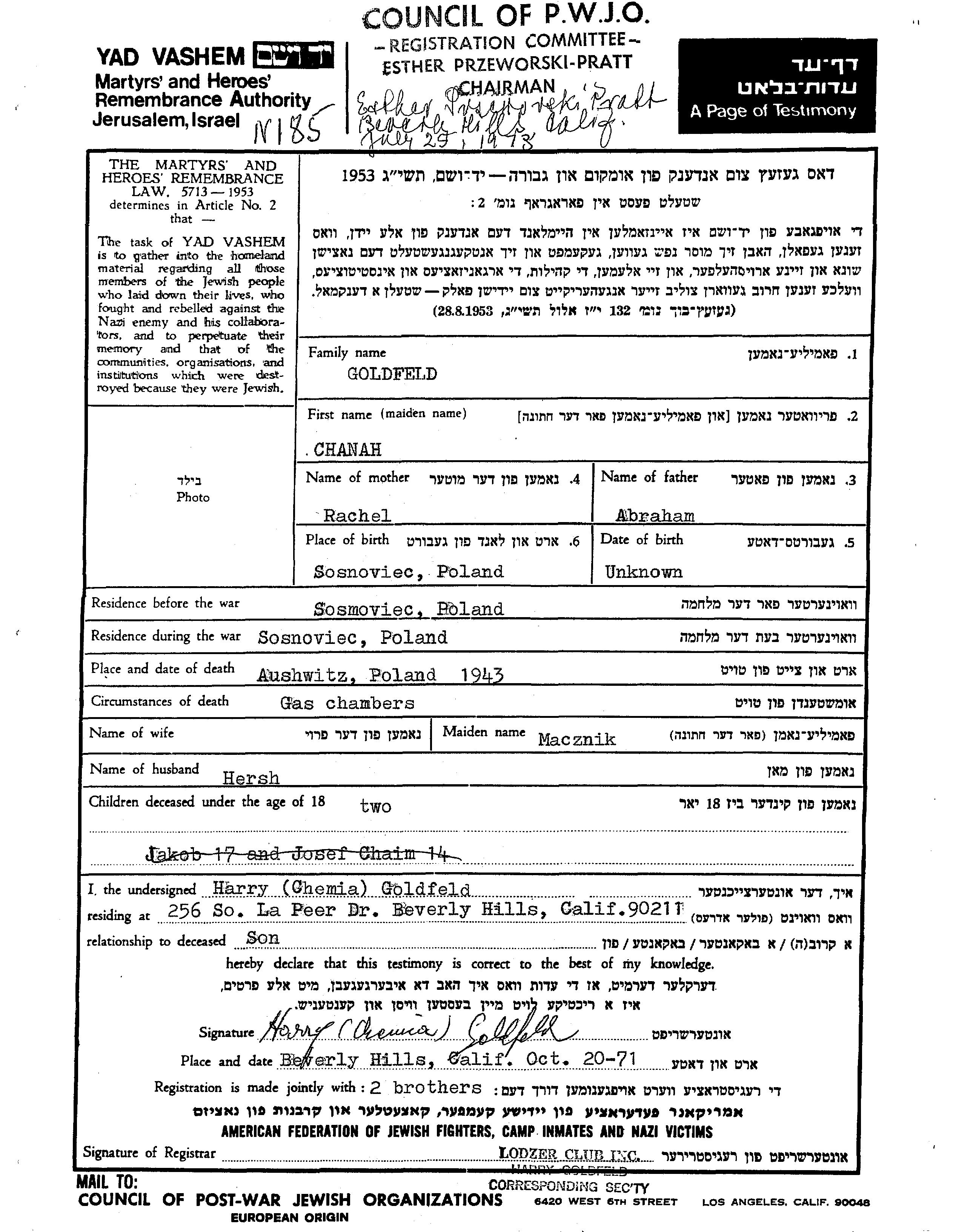Chanah גולדפלד נולדה בSosnowiec שבפולין לAbraham ורחל. היא היתה נשואה לHersh. לפני מלחמת העולם השניה התגוררה בSosnowiec שבפולין. בזמן המלחמה היא היתה בSosnowiec שבפולין.