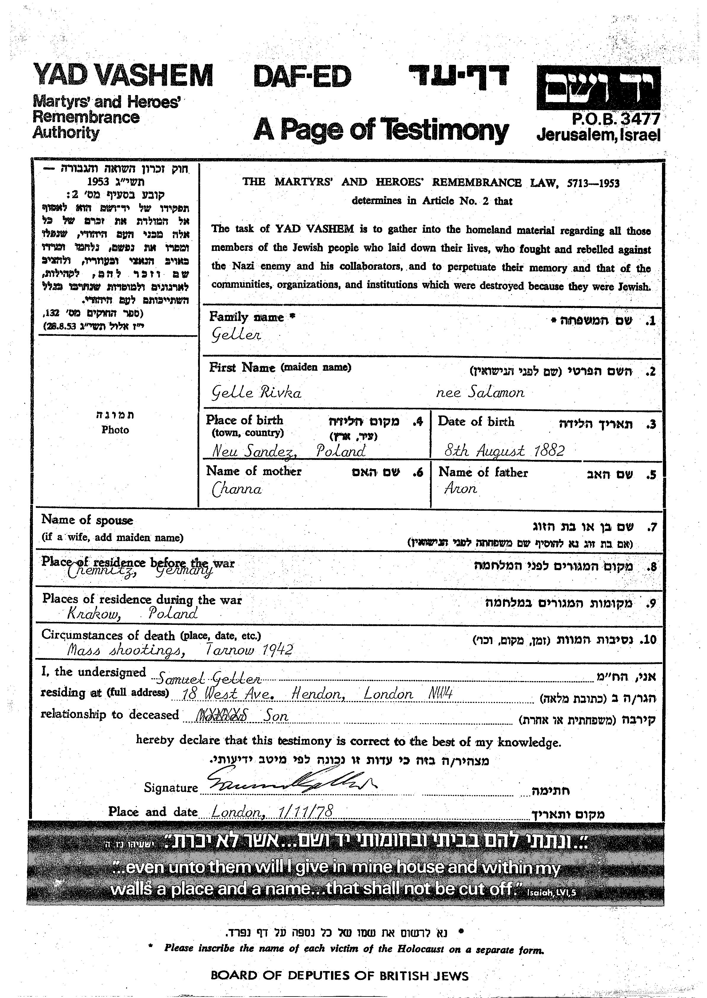 רבקה Geller נולדה בNeu Sandez שבפולין בשנת 1882 לארון וChanna. לפני מלחמת העולם השניה התגוררה בChemnitz שבגרמניה. בזמן המלחמה היא היתה בKrakow שבפולין.