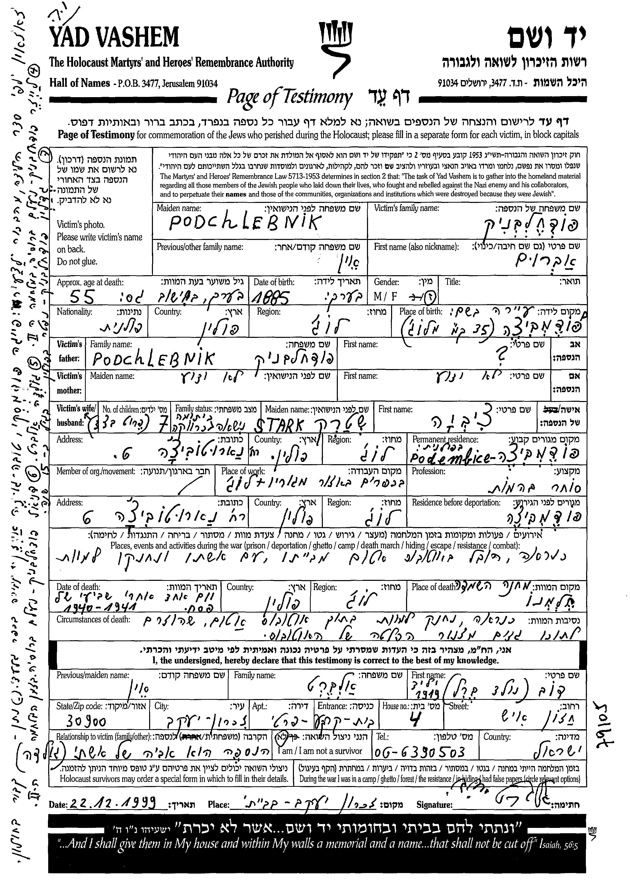 אברום פודחלבניק נולד בPodembice שבפולין בשנת 1885. הוא היה סוחר בהמות ונשוי לציביה לבית שטרק. לפני מלחמת העולם השניה התגורר בPodembice שבפולין. בזמן המלחמה הוא היה בPodembice שבפולין. אברום נרצח בשואה. מקום המוות: Chelmno שבפולין בשנת 1941.