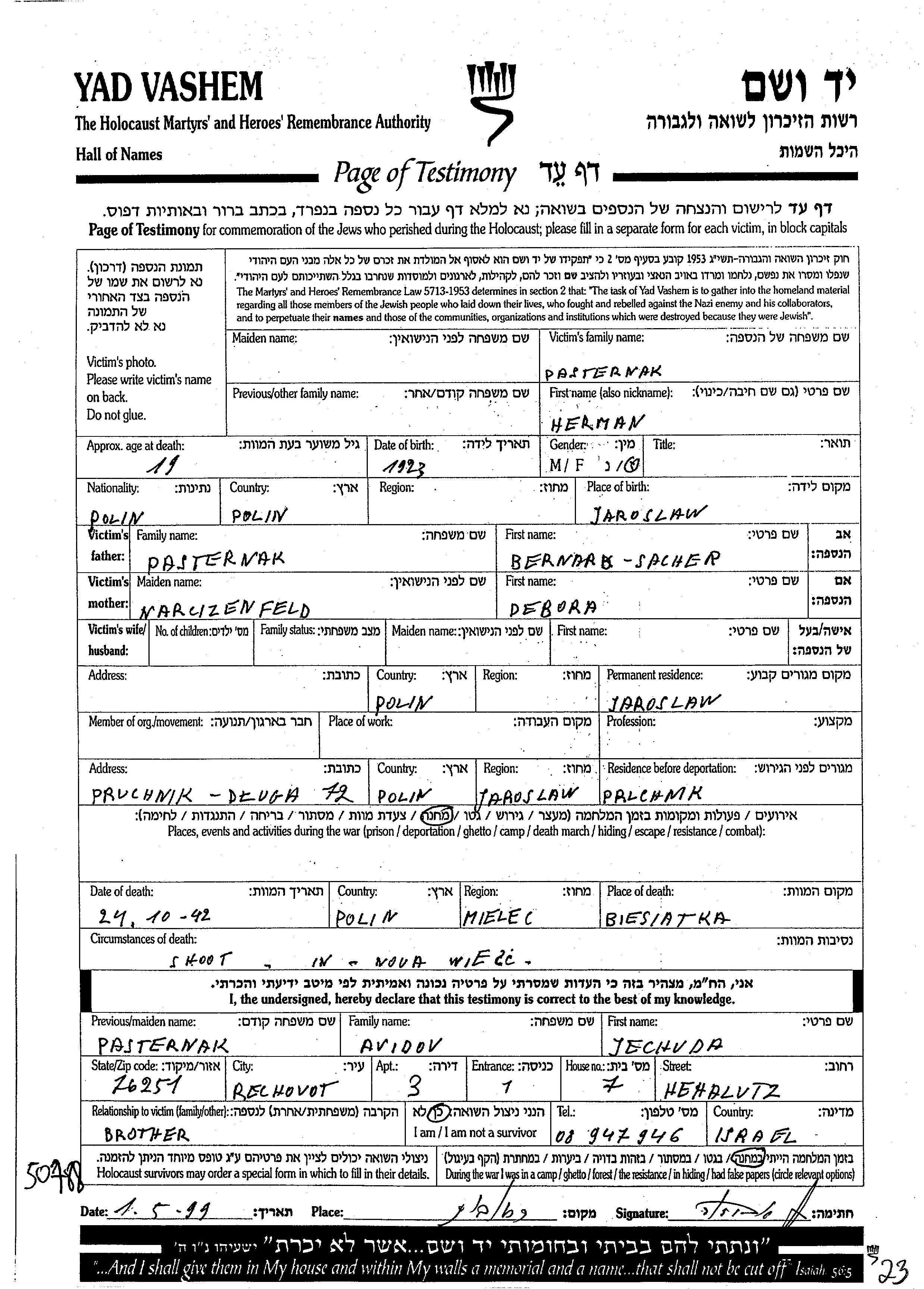 הרמן פסטרנק נולד בJaroslaw שבפולין בשנת 1923 לSacher ברנרד וDebora לבית Narcizenfeld. הוא היה רווק. לפני מלחמת העולם השניה התגורר בJaroslaw שבפולין. בזמן המלחמה הוא היה במחנה. הרמן נרצח בשואה. מקום המוות: Nowa Wies שבפולין בשנת 24/10/1942.