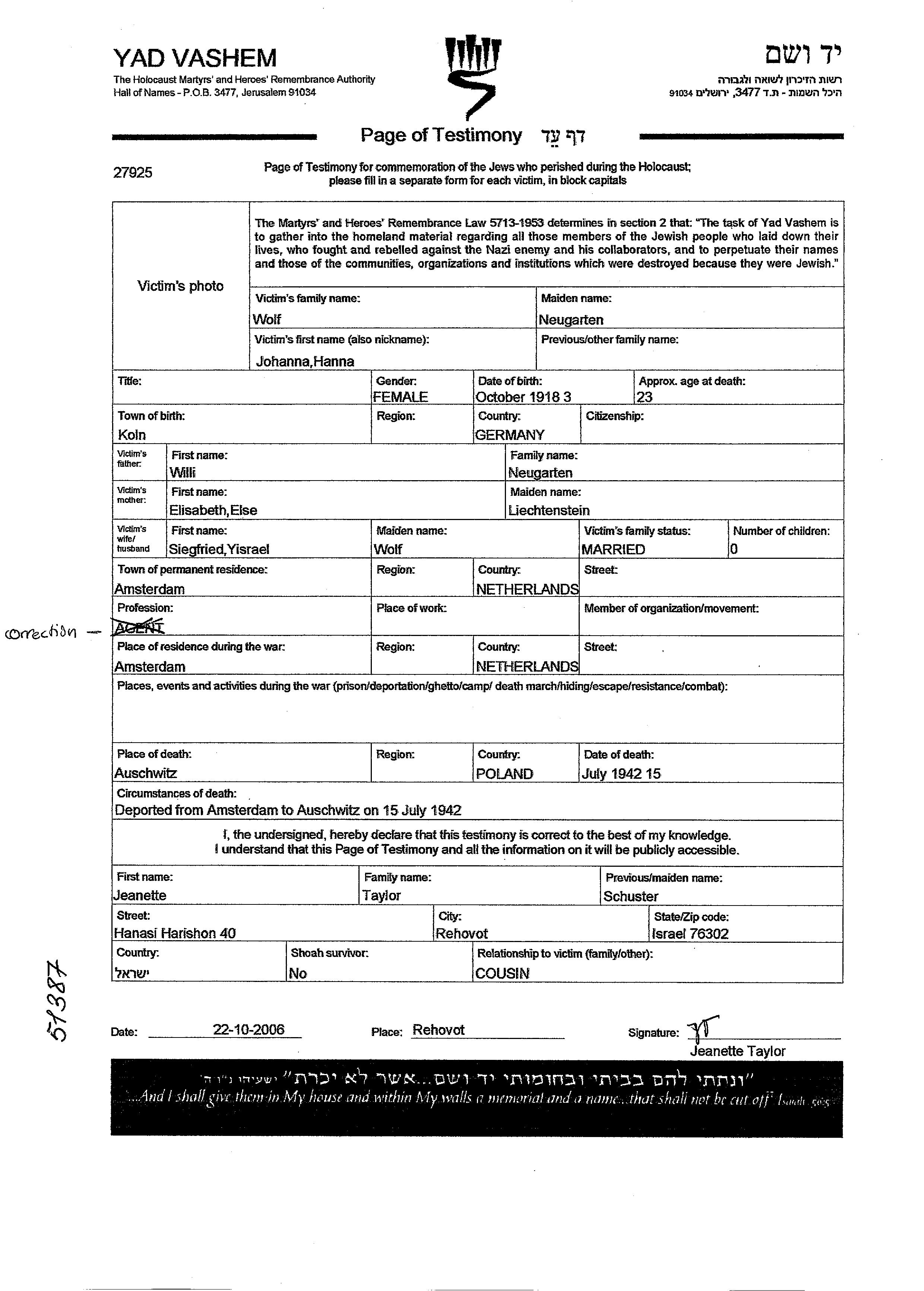 Wolf Hanna Johanna 1918 Amsterdam, הולנד דף-עד (מקוון חתום)
