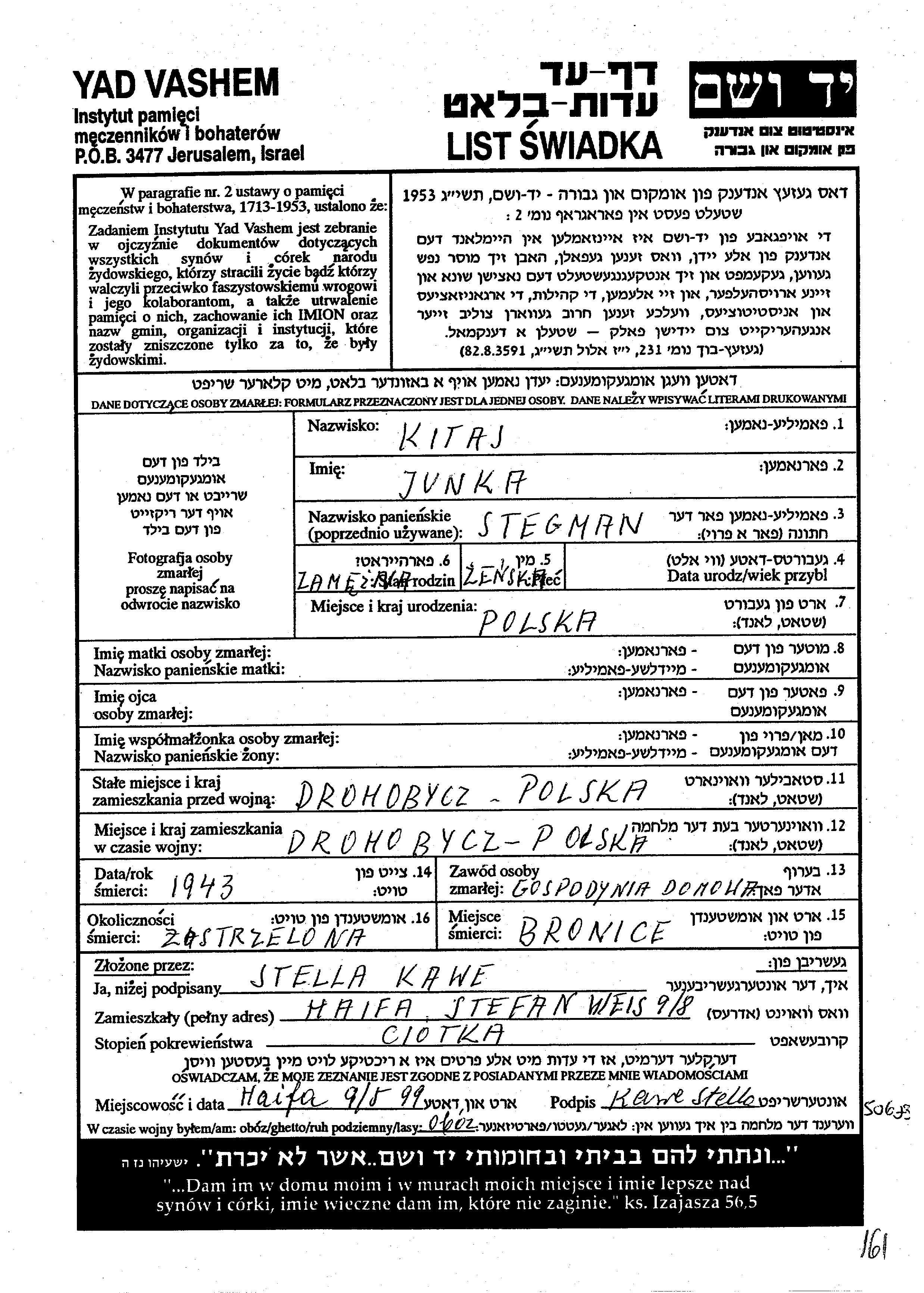 Junka Kitaj לבית Stegmann נולדה בפולין. היא היתה עקרת בית ונשואה. לפני מלחמת העולם השניה התגוררה בDrohobycz שבפולין. בזמן המלחמה היא היתה בDrohobycz שבפולין.