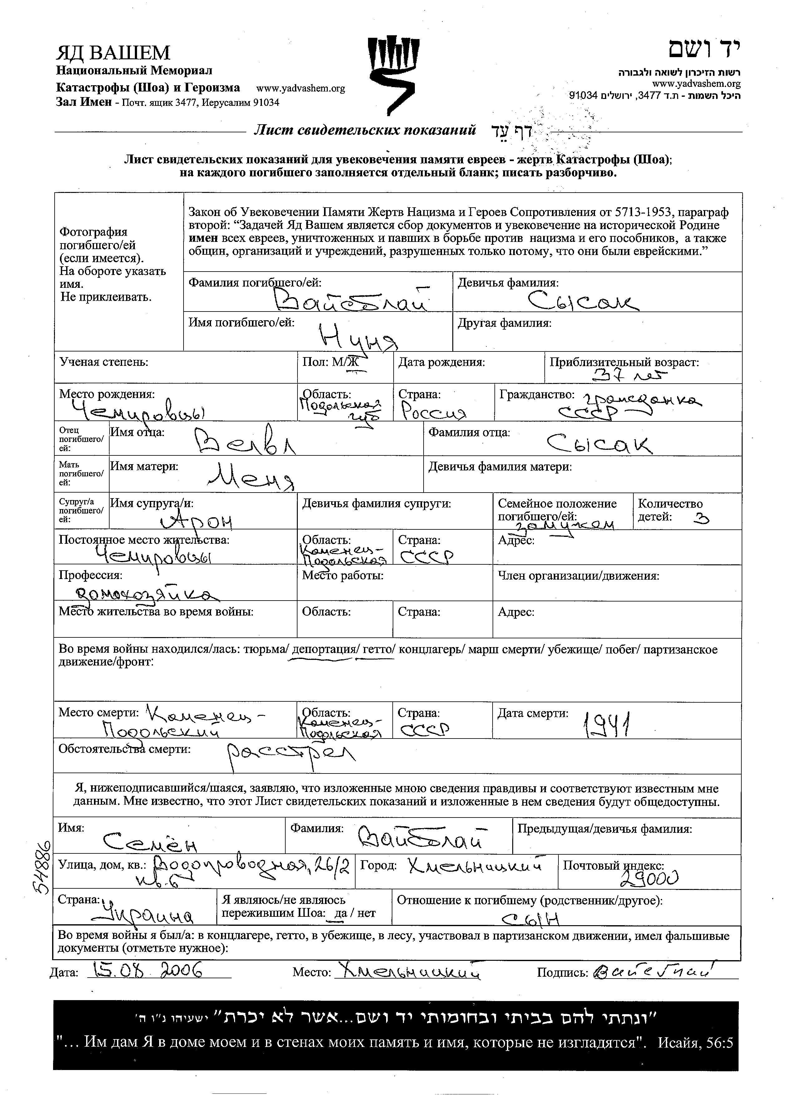 Vaisblai Nunya Chemerovtsy, אוקראינה (ברה"מ) דף-עד