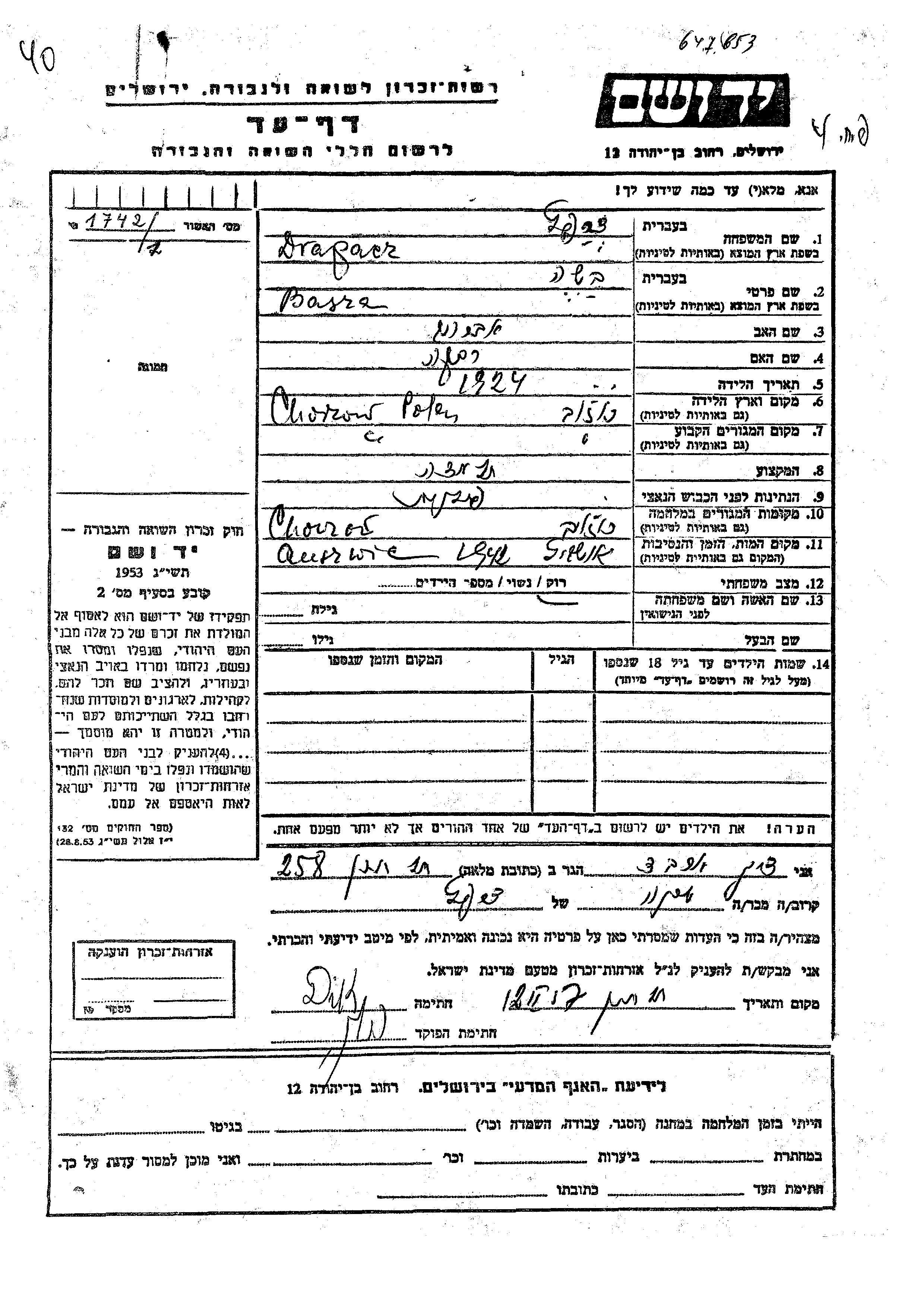 Basza Drapacz נולדה בChorzów שבפולין בשנת 1924 לאברהם ורבקה. היא היתה תלמידה ורווקה. לפני מלחמת העולם השניה התגוררה בChorzów שבפולין. בזמן המלחמה היא היתה בChorzów שבפולין.