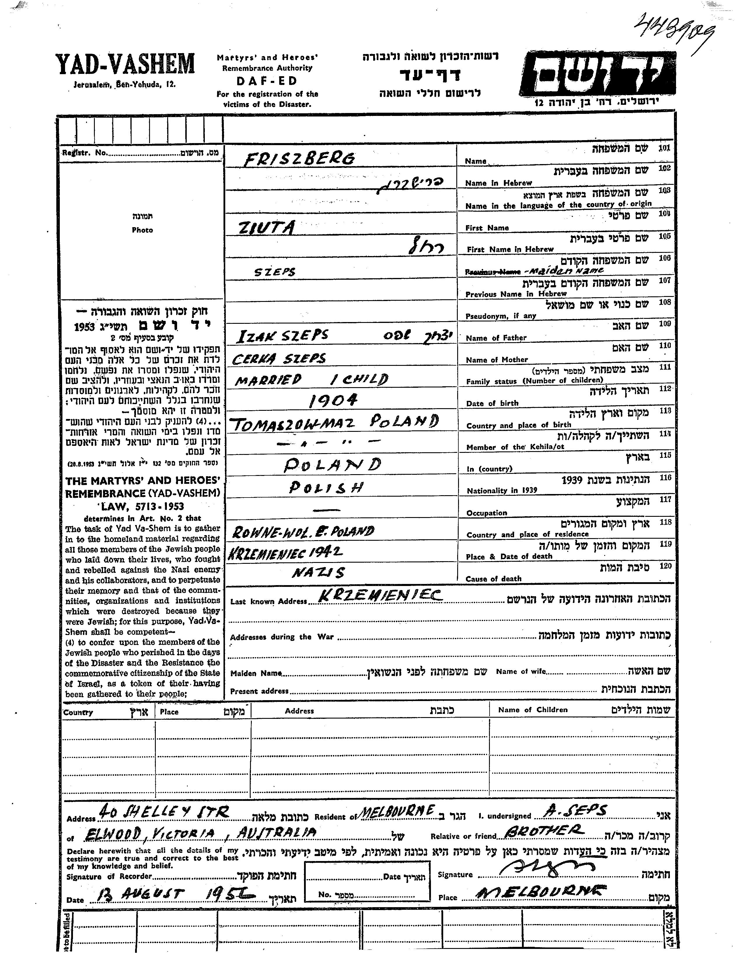 Ziuta רחל Friszberg לבית Szeps נולדה בTomaszow Mazowieckie שבפולין בשנת 1904 לאיזק וCerka. היא היתה נשואה. לפני מלחמת העולם השניה התגוררה בTomaszow Mazowieckie שבפולין. בזמן המלחמה היא היתה בKrzemieniec שבפולין.