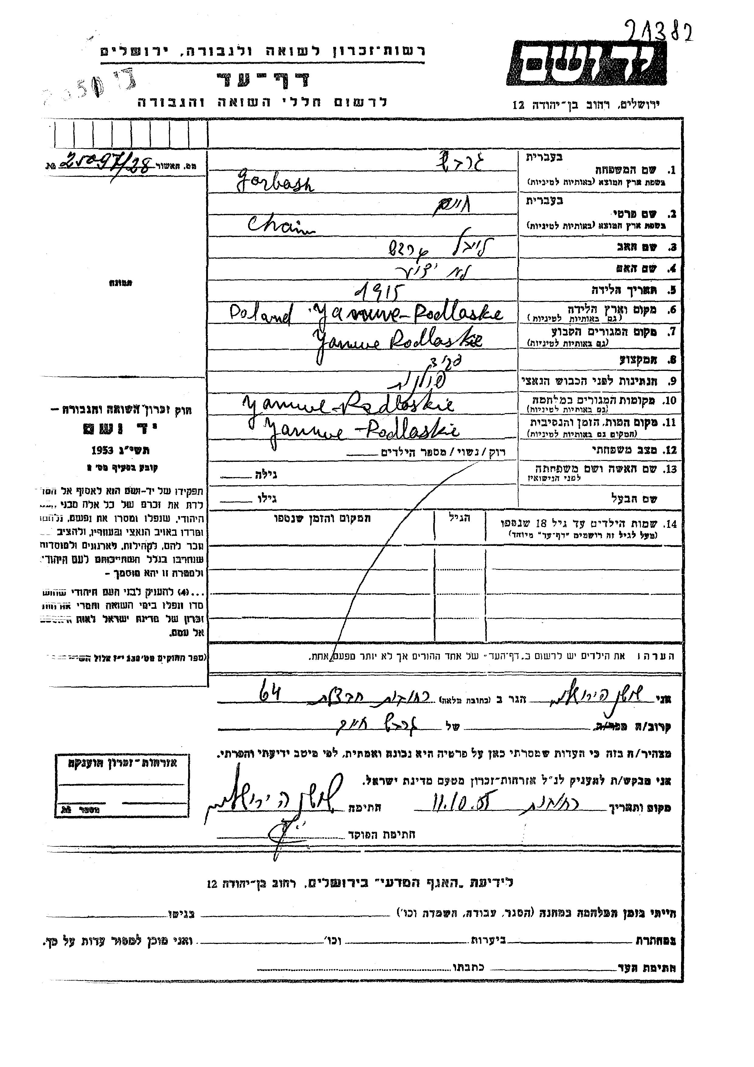 חיים גרבש נולד בJanow Podlaski שבפולין בשנת 1915 ללייבל. הוא היה פקיד. לפני מלחמת העולם השניה התגורר בJanow Podlaski שבפולין. בזמן המלחמה הוא היה בJanow Podlaski שבפולין. חיים נרצח בשואה. מקום המוות: Janow Podlaski שבפולין.