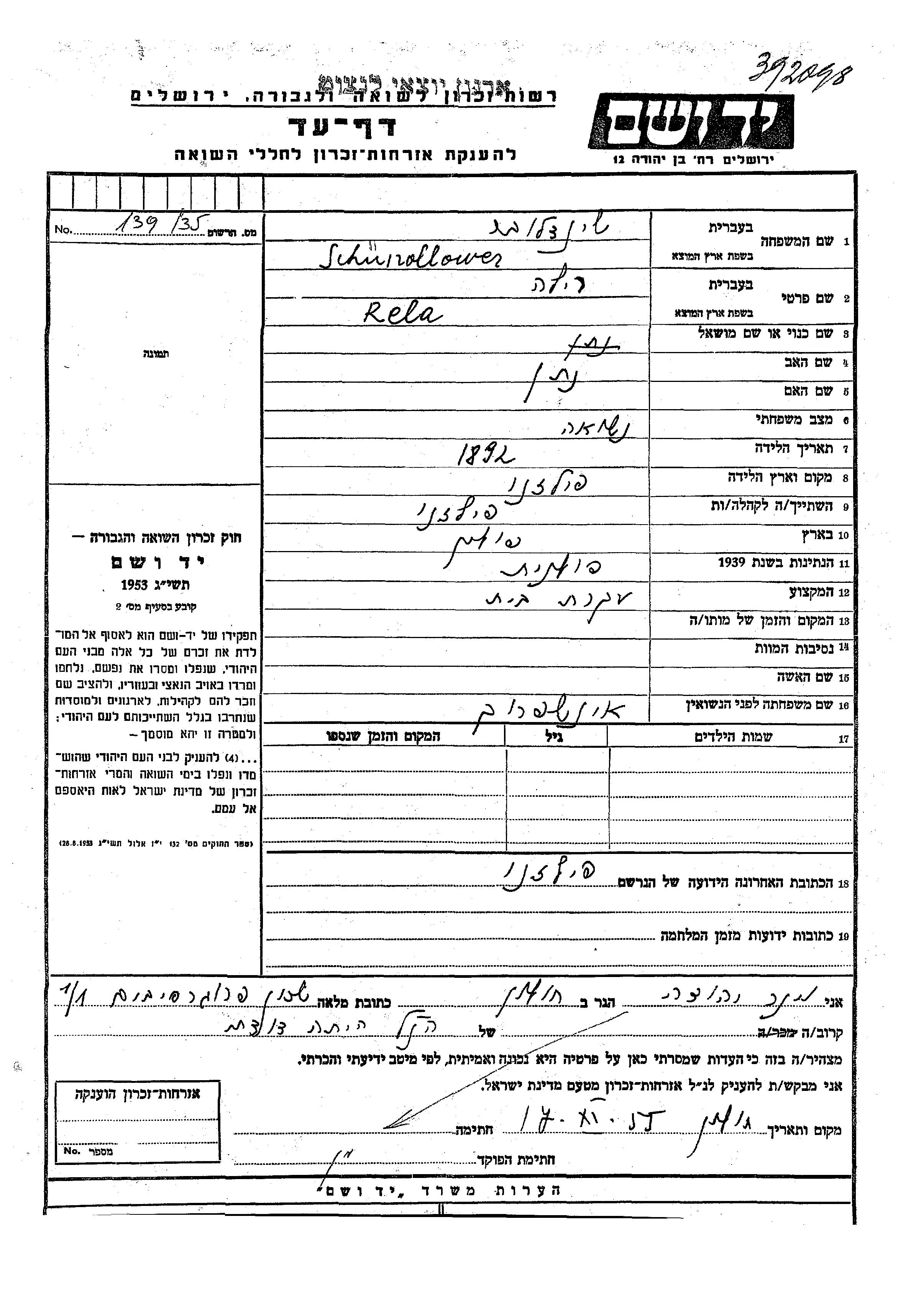 רלה Schuendlower לבית אינשפרוך נולדה בPilzno שבפולין בשנת 1892 לנתן. היא היתה נשואה. לפני מלחמת העולם השניה התגוררה בPilzno שבפולין.