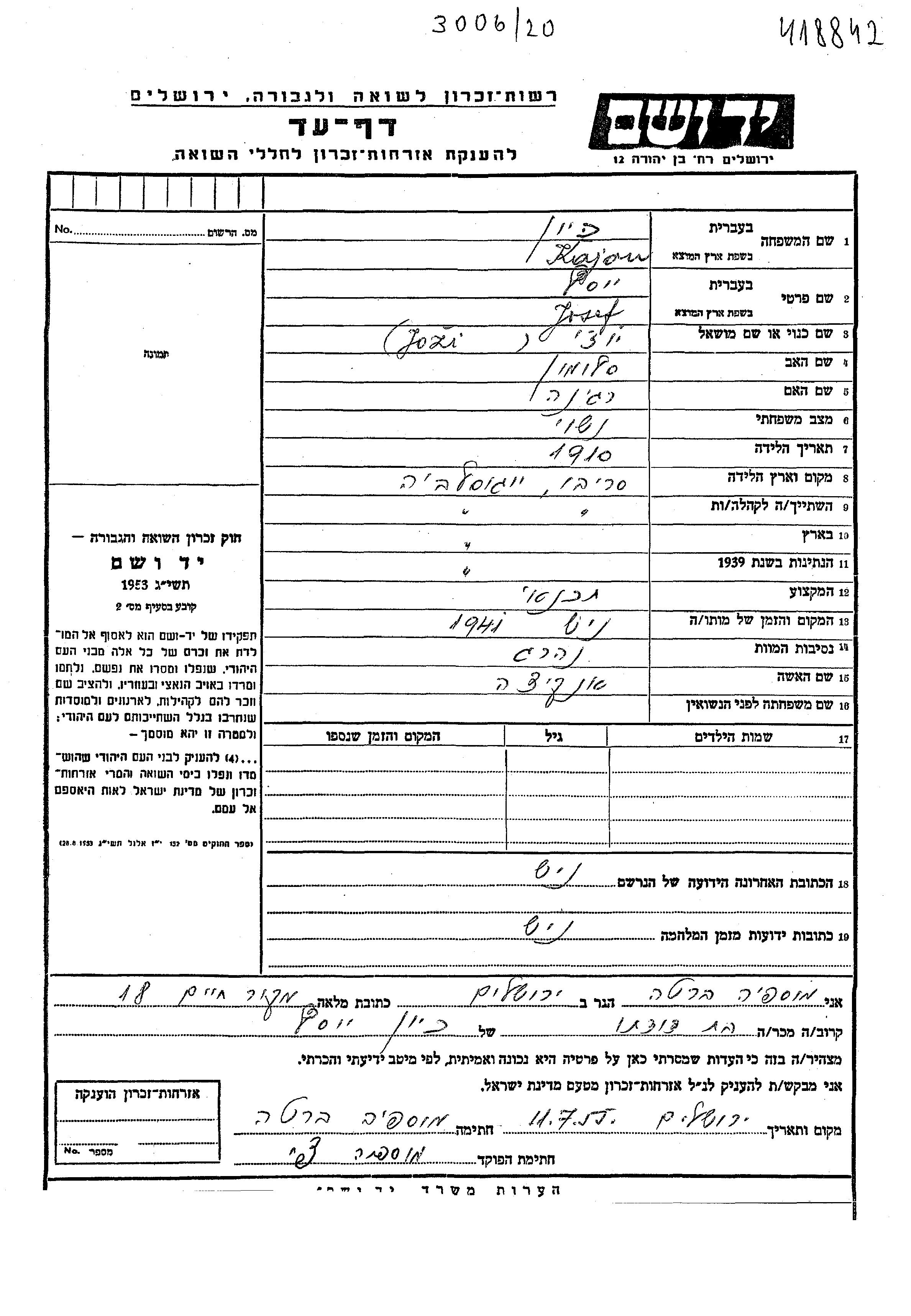 הוא נרצח בשואה. מקום המוות: Nish שביוגוסלביה בשנת 1941.