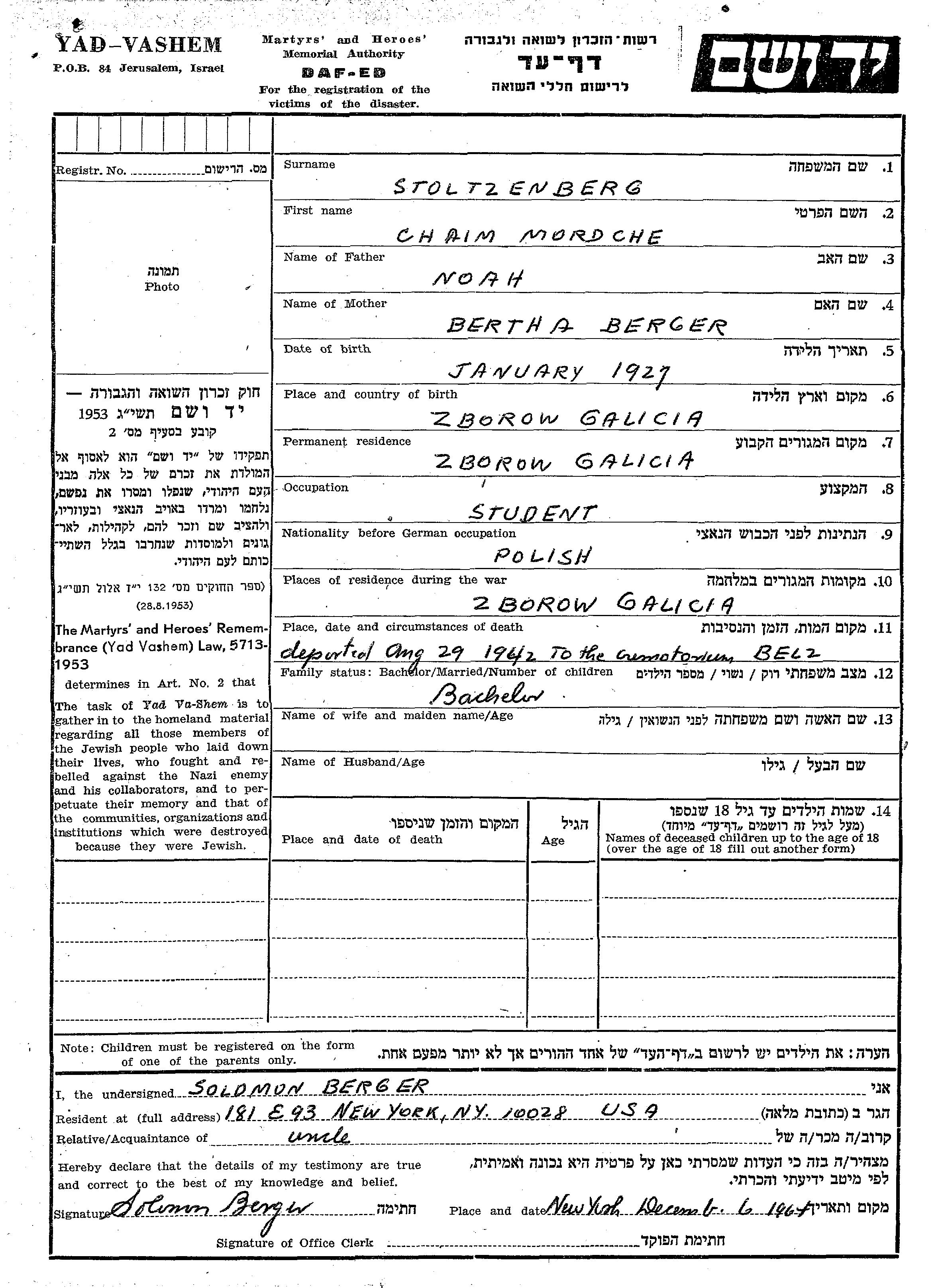 חיים Mordche Stolzenberg נולד בZborow שבפולין בשנת 1921 לNoah וBertha לבית Berger. הוא היה סטודנט ורווק. לפני מלחמת העולם השניה התגורר בZborow שבפולין. בזמן המלחמה הוא היה בZborow שבפולין.