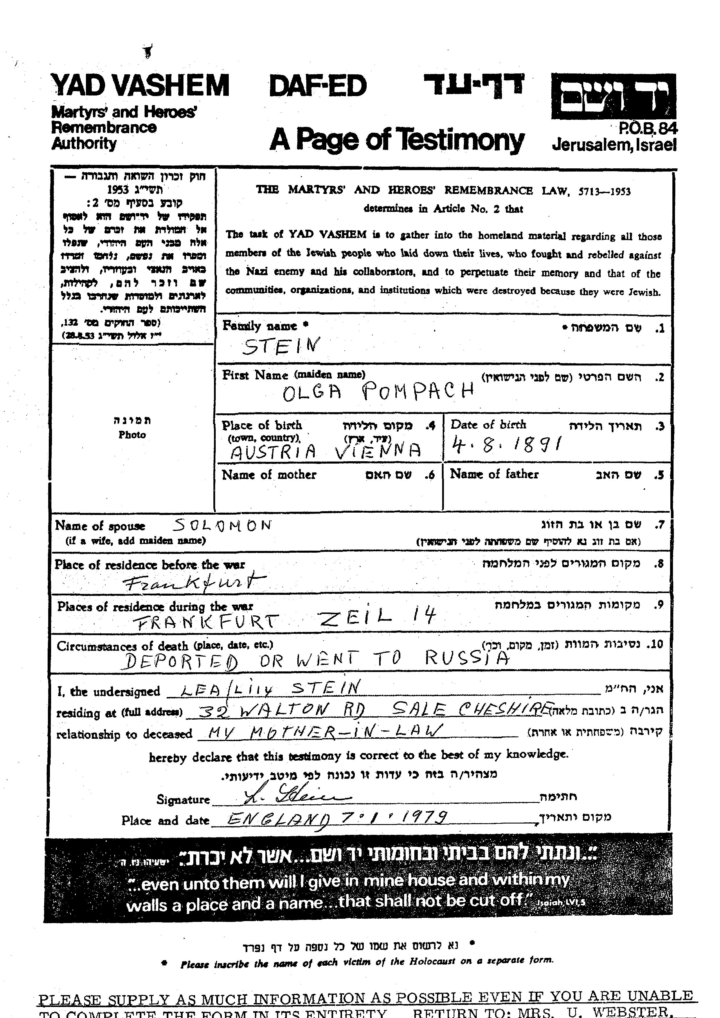 אולגה Stein לבית Pompach נולדה בVienna שבאוסטריה בשנת 1891. היא היתה נשואה לסולומון. לפני מלחמת העולם השניה התגוררה בFrankfurt שבגרמניה. בזמן המלחמה היא היתה בFrankfurt שבגרמניה.