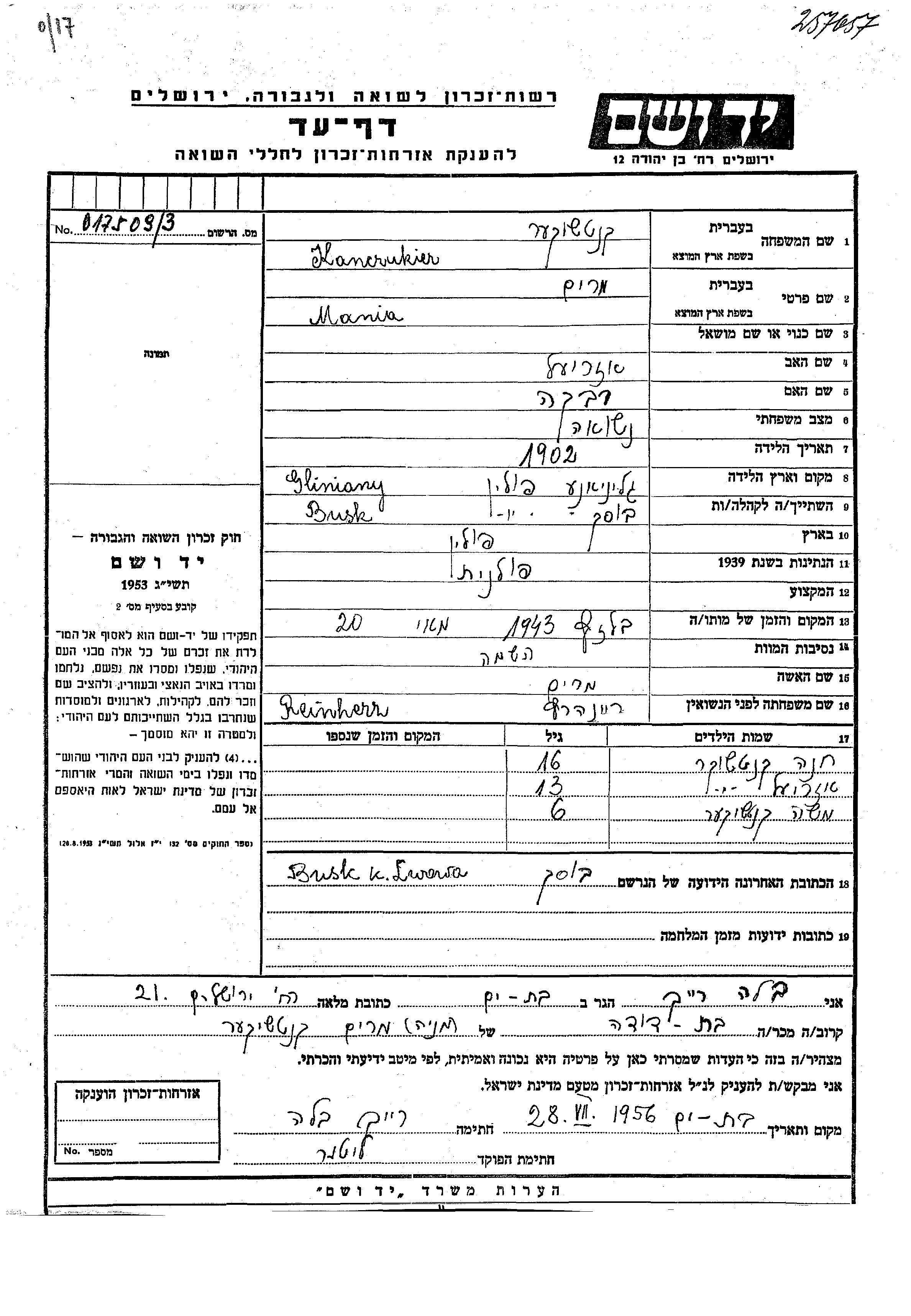 מריה מרים Kanczukier לבית Reinherz נולדה בGliniany שבפולין בשנת 1902 לאזריעל ורבקה. היא היתה נשואה. לפני מלחמת העולם השניה התגוררה בBusk שבפולין. מריה מרים נרצחה בשואה. מקום המוות: Belzec שבפולין בשנת 20/05/1943.