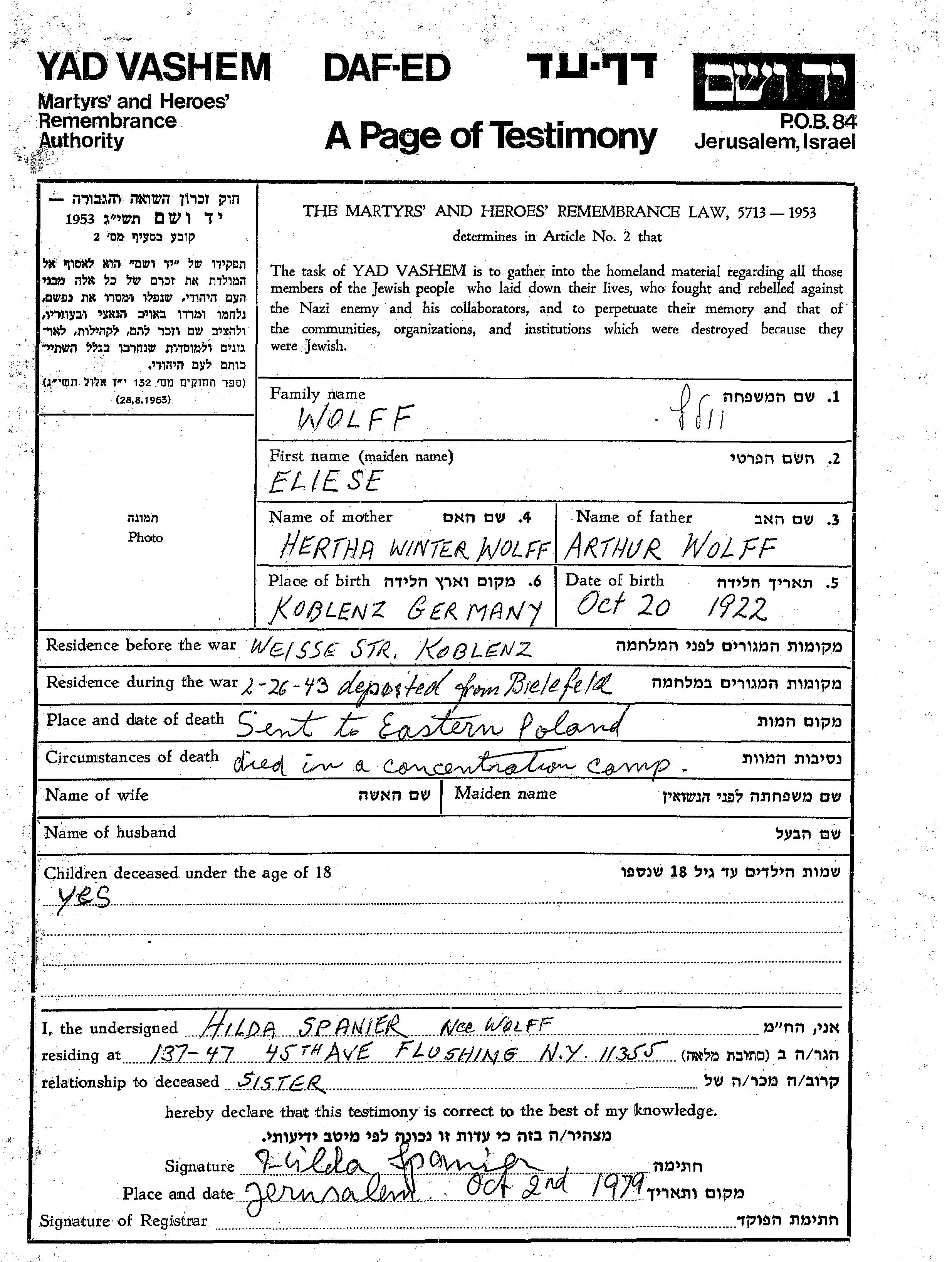 Eliese Wolff נולדה בKoblenz שבגרמניה בשנת 1922 לArthur וHertha. היא היתה נשואה. לפני מלחמת העולם השניה התגוררה בKoblenz שבגרמניה. בזמן המלחמה היא היתה בBielefeld Schildesche שבגרמניה. היא נרצחה בשואה.