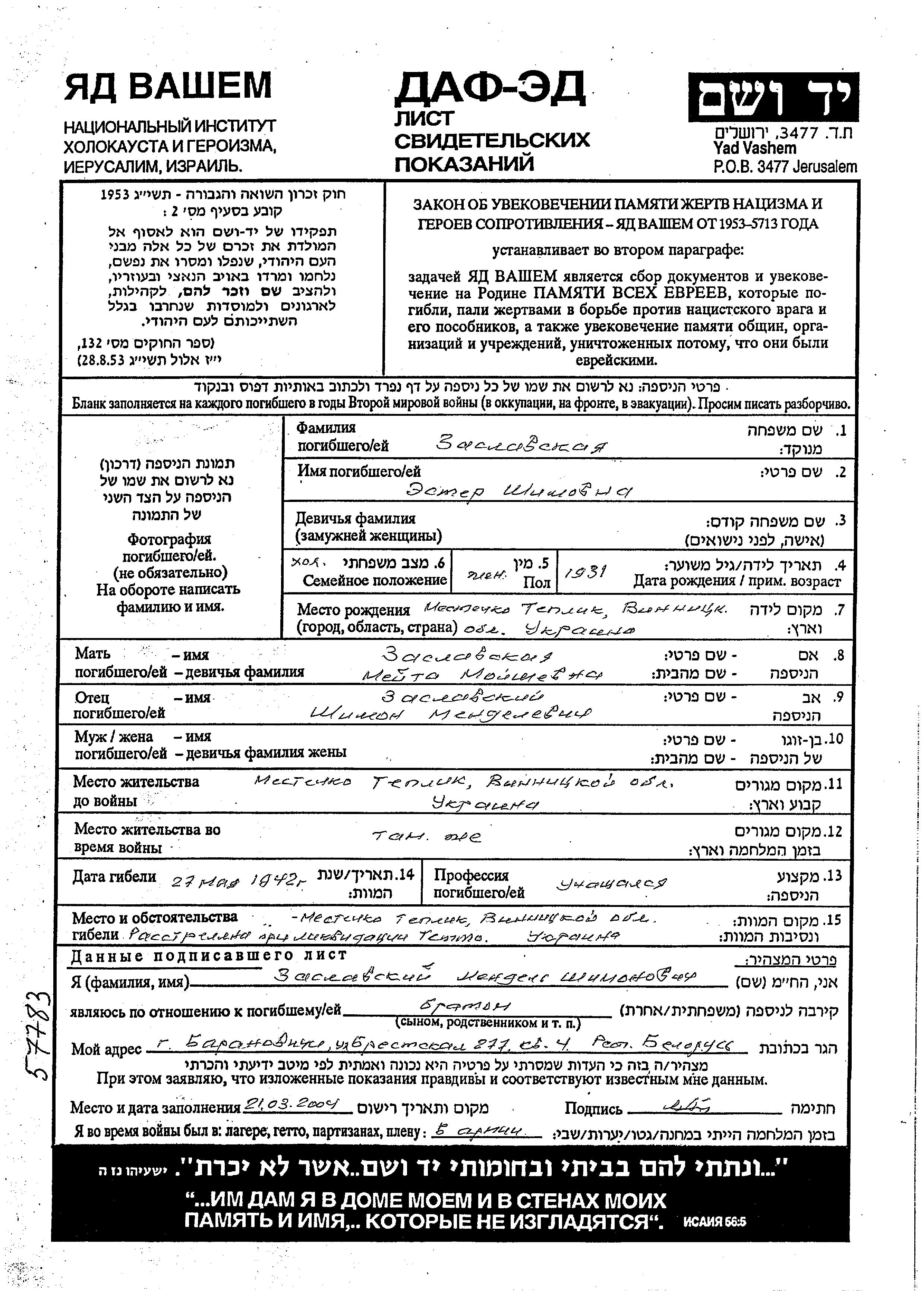 אסתר Zaslavskaya נולדה בTeplik שבאוקראינה (ברה"מ) בשנת 1931 לשמעון ומייטה. היא היתה Uchashchayasya וילדה. לפני מלחמת העולם השניה התגוררה בTeplik שבאוקראינה (ברה"מ). בזמן המלחמה היא היתה בTeplik שבאוקראינה (ברה"מ). אסתר נרצחה בשואה. מקום המוות: Teplik שבאוקראינה (ברה"מ) בשנת 27/05/1942.