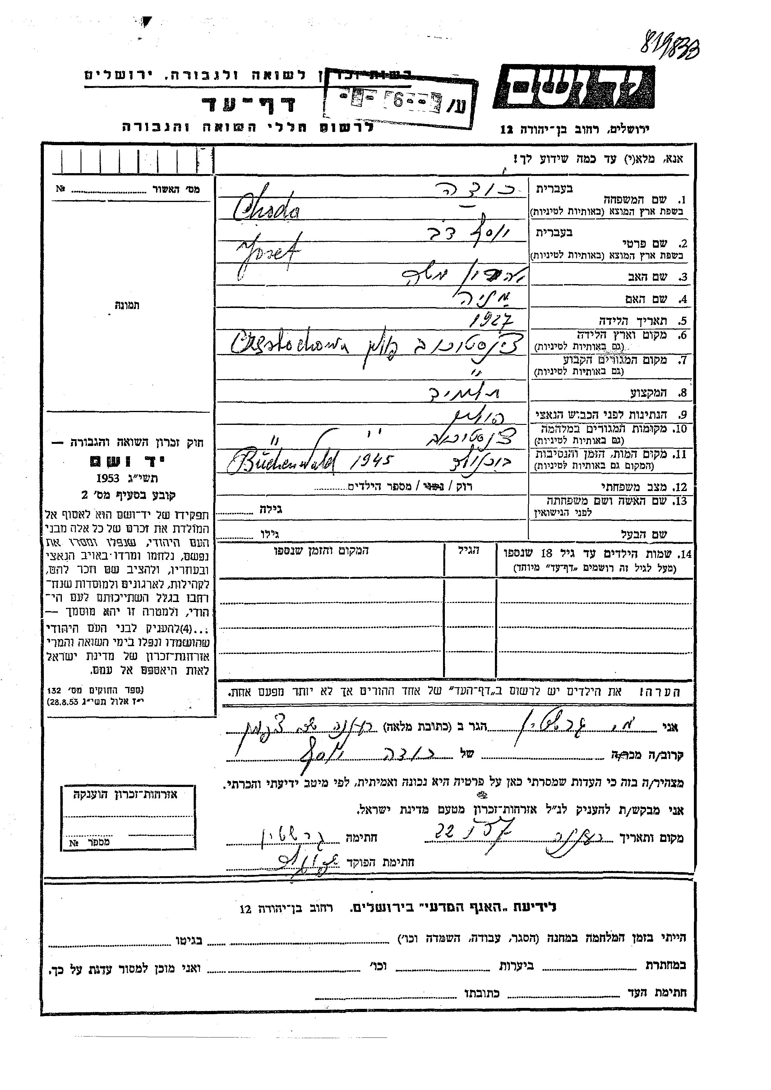 יד ושם - המפעל להנצחת השמות בדפי עד