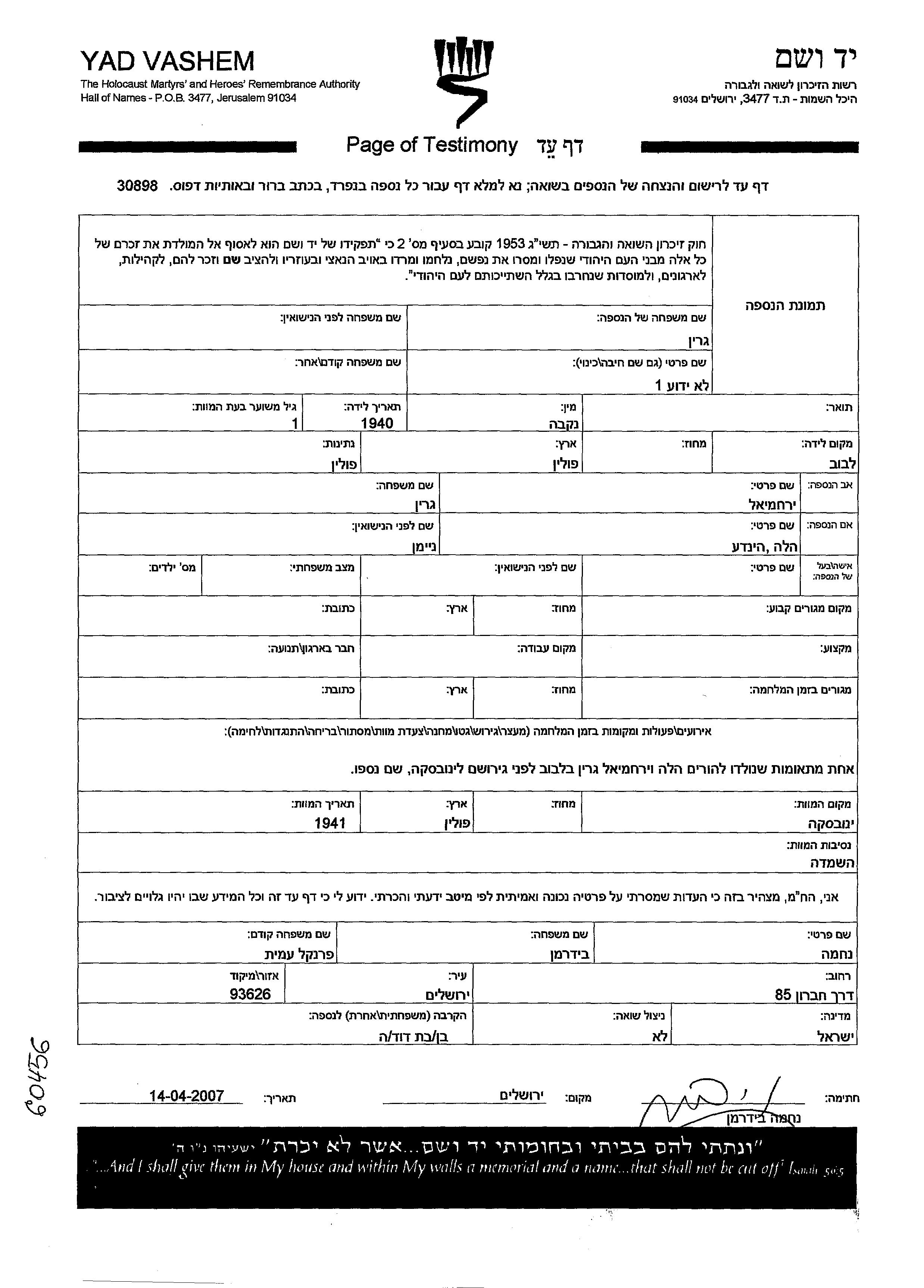 שם פרטי לא ידוע גרין נולדה בLwow שבפולין בשנת 1940 לירחמיאל והינדע הלה לבית ניימן. היא היתה תינוקת. לפני מלחמת העולם השניה התגוררה בLwow שבפולין. בזמן המלחמה היא היתה בLwow שבפולין. היא נרצחה בשואה. מקום המוות: Janowska שבפולין בשנת 1941.