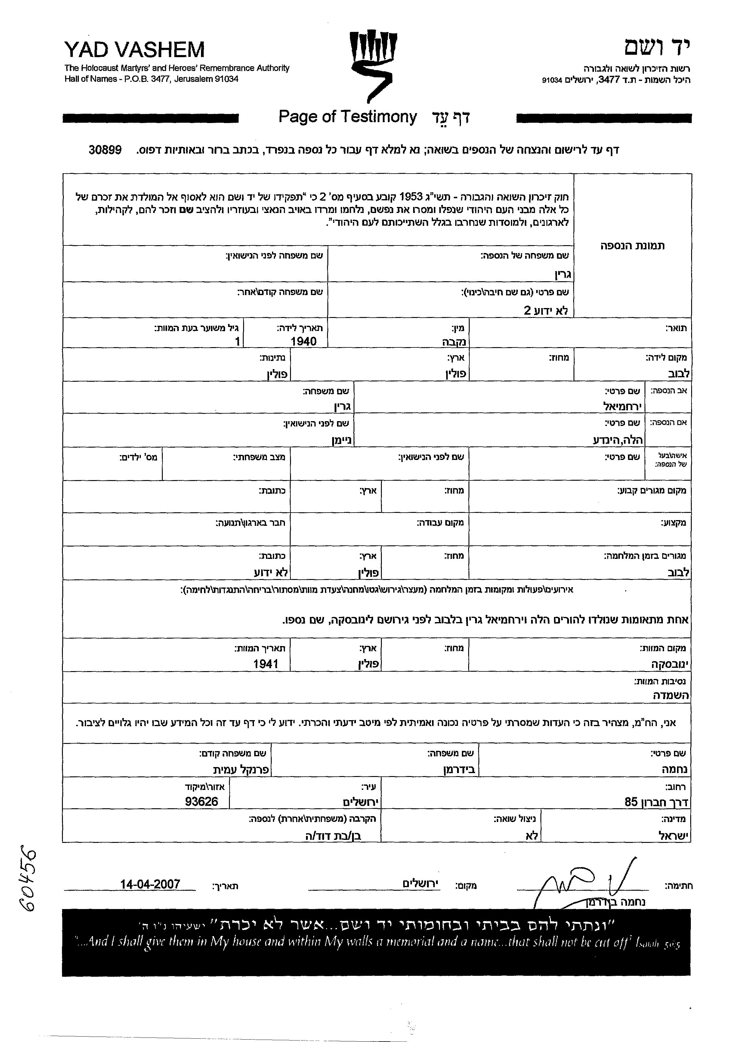 גרין שם פרטי לא ידוע 1940 Lwow, פולין דף-עד (מקוון חתום)
