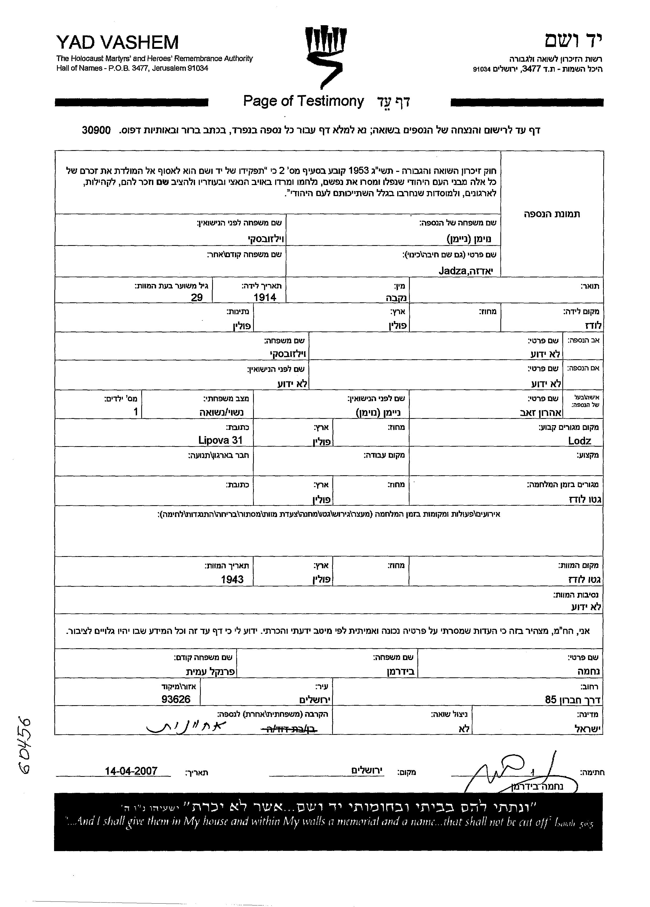 Jadza ניימן לבית וילזובסקי נולדה בLodz שבפולין בשנת 1914. היא היתה נשואה לזאב אהרון. לפני מלחמת העולם השניה התגוררה בLwow שבפולין. בזמן המלחמה היא היתה בLodz שבפולין. היא נרצחה בשואה. מקום המוות: Lodz שבפולין בשנת 1943.
