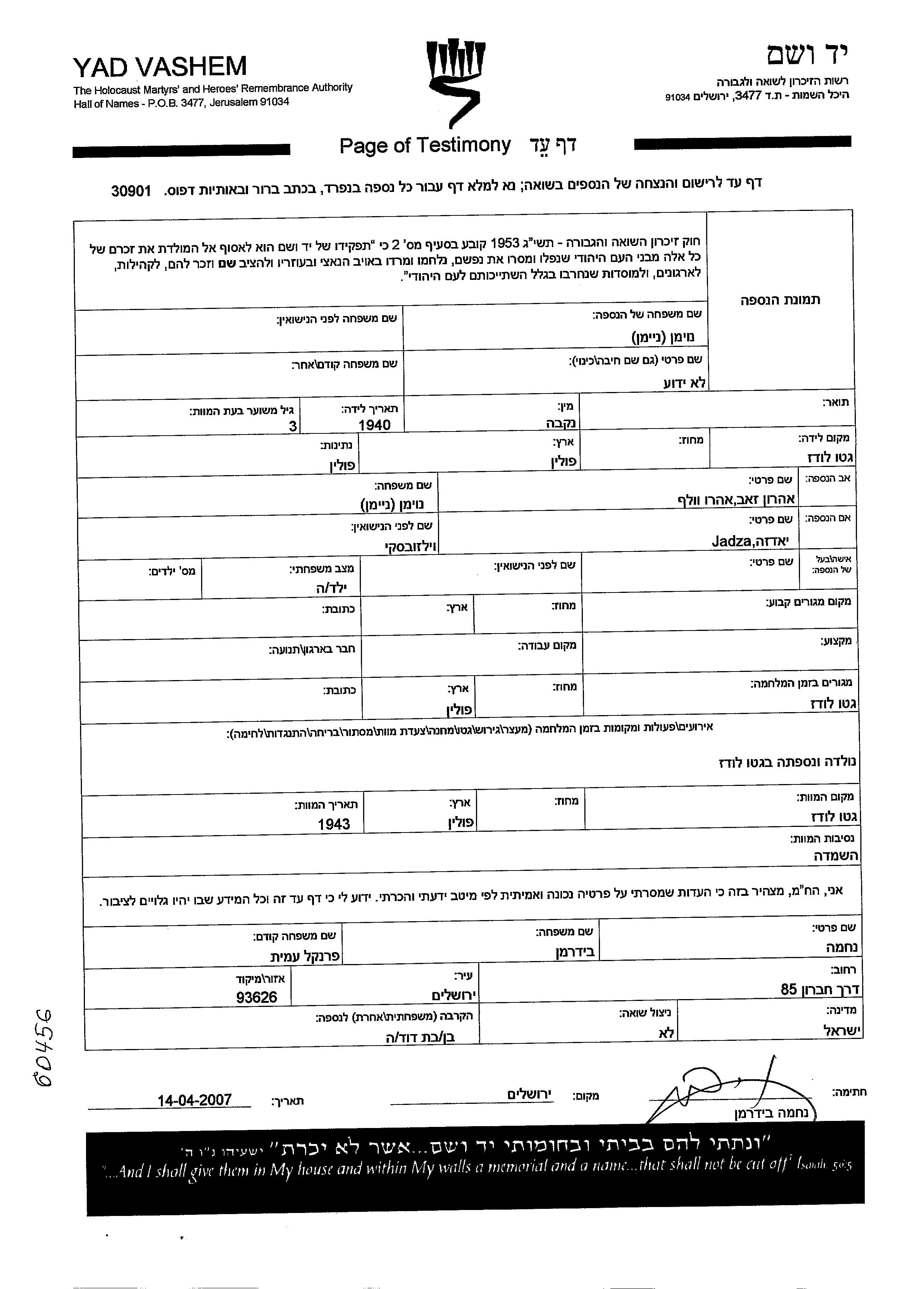 שם פרטי לא ידוע נוימן נולדה בLodz שבפולין בשנת 1940 לאהרון וולף זאב ויאדזה לבית וילזובסקי. היא היתה ילדה. לפני מלחמת העולם השניה התגוררה בLodz שבפולין. בזמן המלחמה היא היתה בLodz שבפולין. היא נרצחה בשואה. מקום המוות: Lodz שבפולין בשנת 1943.