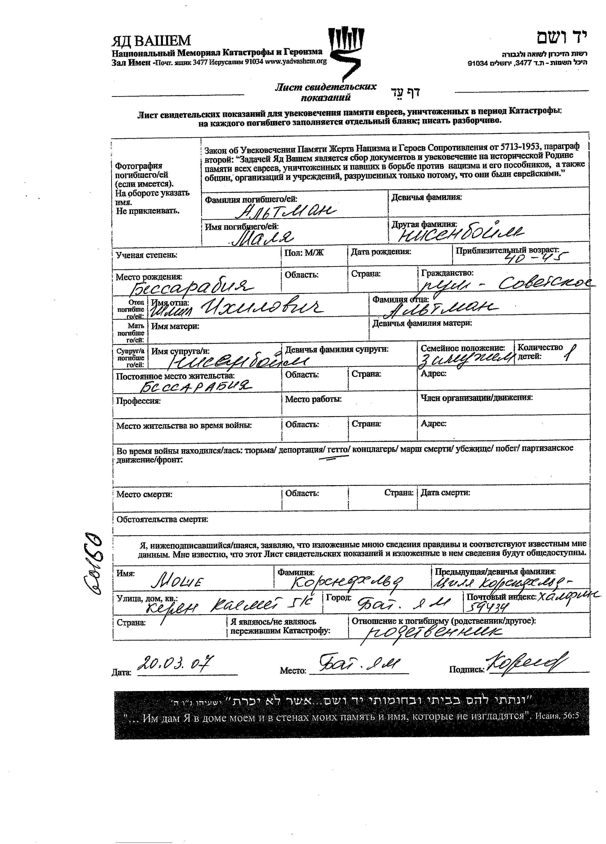 Malya אלטמן לבית Nisenboim נולדה בBessarabia,רומניה שברומניה לShmil. היא היתה נשואה. לפני מלחמת העולם השניה התגוררה בBessarabia,רומניה שברומניה. בזמן המלחמה היא היתה בBessarabia,רומניה שברומניה.