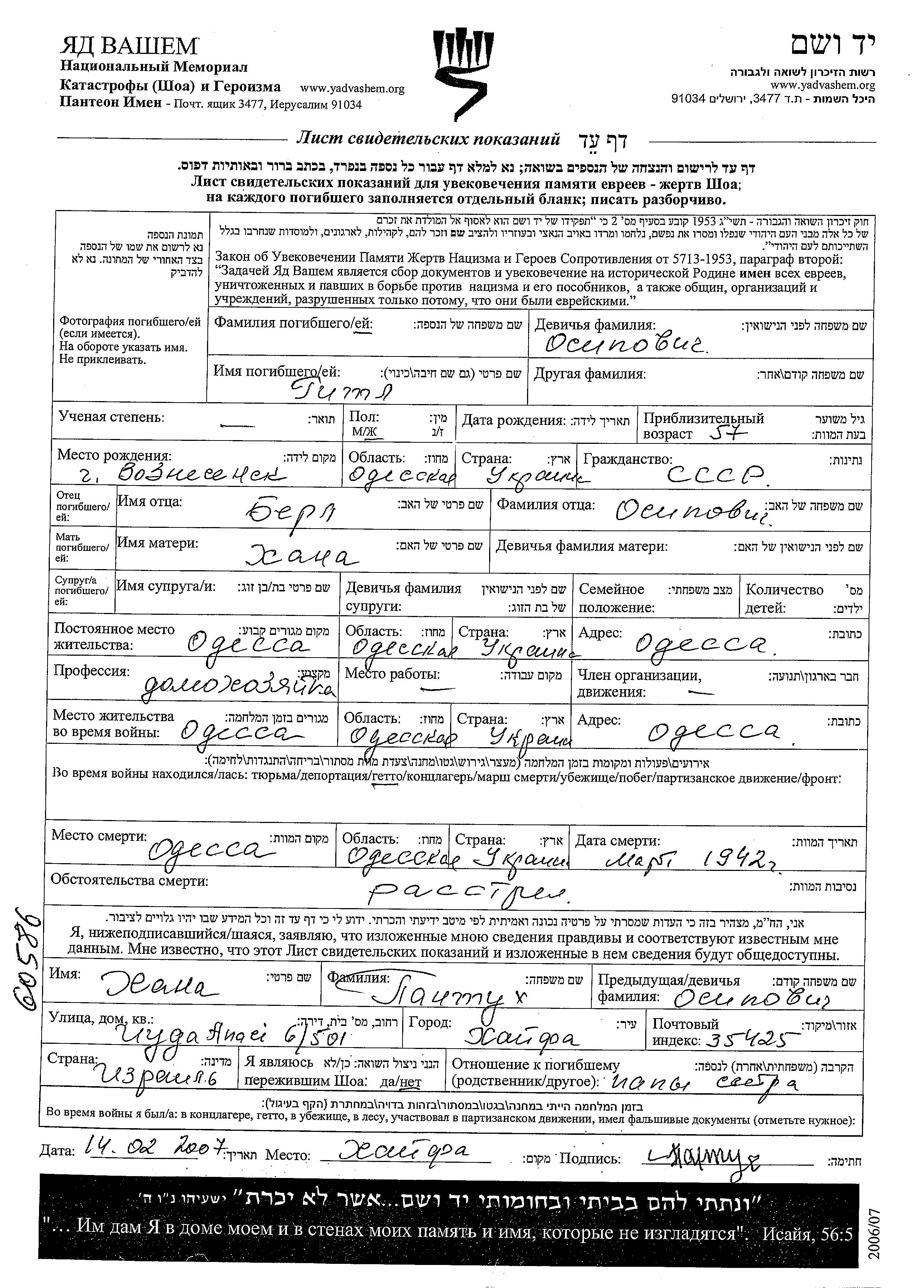 היא נרצחה בשואה. מקום המוות: Odessa שבאוקראינה (ברה"מ) בשנת 03/1942.